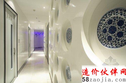 在空间的布局上运用了“曲能生倩”的手法,在空间中营造了一些流畅的曲线,即活跃了空间气氛又结合了“青花瓷”圆润的表情。空间装饰上遵循老子道德经里“素以为眩”的审美原则,采用“素胚勾勒出青花”的装饰手法,将空间装饰净化到了极致,甚至产生了一种空灵的感觉。包房的设计采用了苏州园林“对景”的手法,在背景墙上做了一些形式不同的窗口,通过窗口,你可以看到挺拔的修竹,也可以看到绽放的红梅,能看到童话世界里的公主和王子,也能穿越时空看到达利的时间。