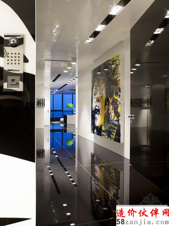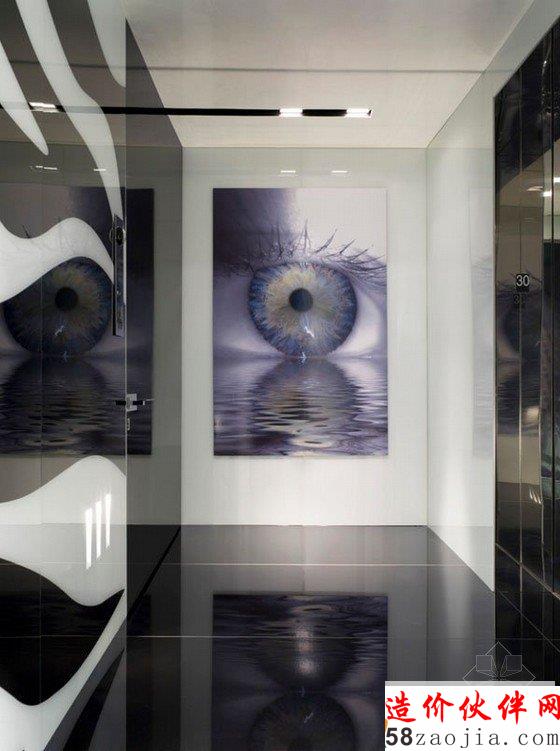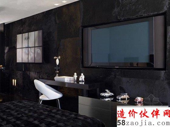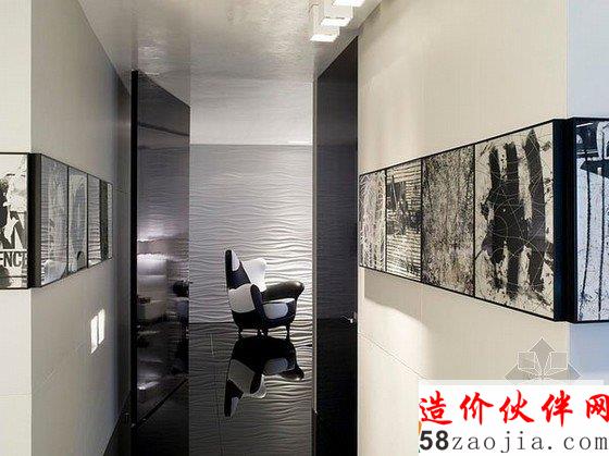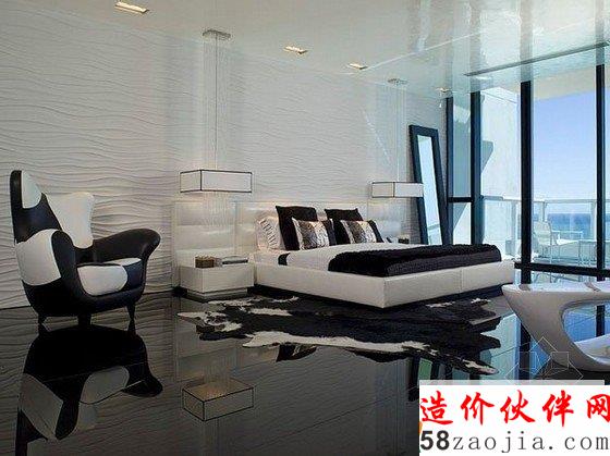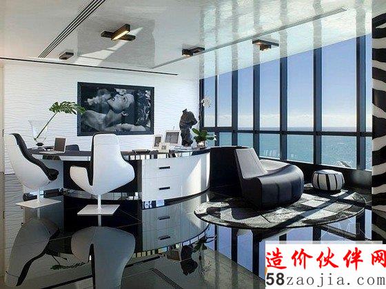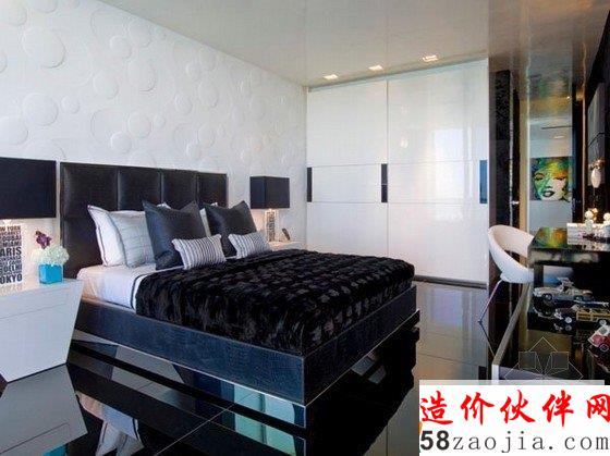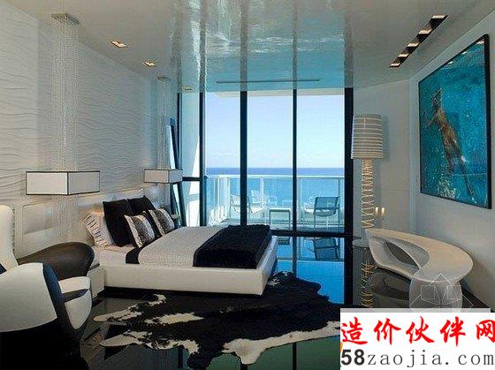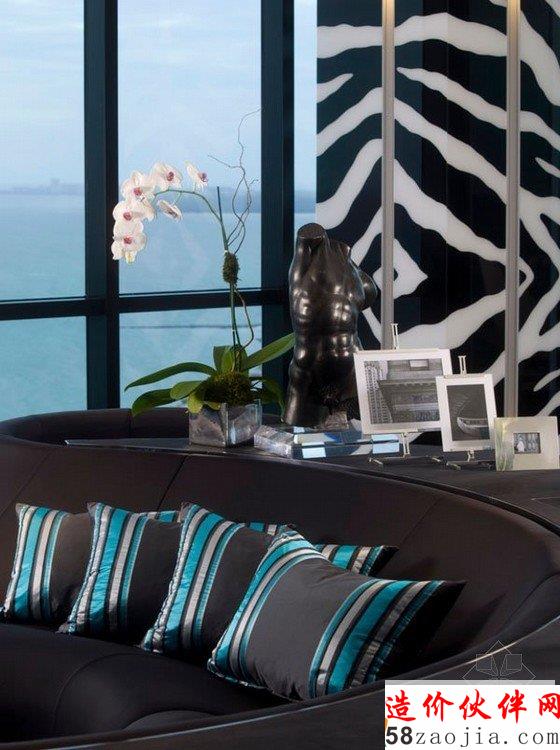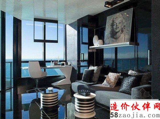 来自迈阿密的豪华黑色调高层海景公寓设计,楼层非常的高可以直接俯瞰到海景,属于景观房。整个公寓的装修很有美国精神,在各个地方都透露着那种独有的气质和时代精神。黑色的地面砖和黑色的门加上顶部的小面积黑色线条让整个空间充满了神秘感。墙面上大幅的现代艺术绘画十分的狂野。无论是墙面还是家具的选择,都有黑色的运用,黑色依然成为了贯穿整个设计的基调。