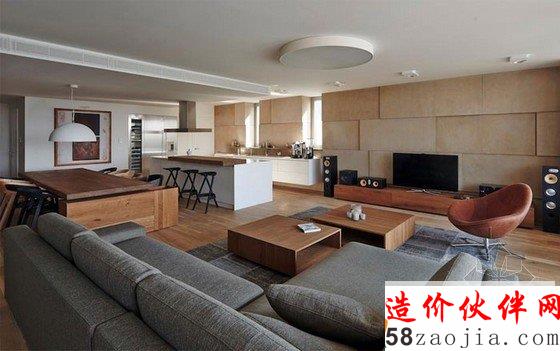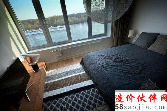 斯洛伐克的Bratislava河滨公寓设计。空间尺度一眼看过去非常的开阔,并且有大面积的落地玻璃窗和玻璃门,采光非常的好。整体布局上采用的是相对开放式,客厅餐厅厨房都是融合在一起了。比较适合度假或者单身公寓的形式。家庭来说稍显局促。不过度假的话就是天堂之选了。在装饰材料商,该案例采用了大面积的木饰面作为装饰材料。并且色调非常的统一。这种木色有点仿古的感觉。会让整体氛围多一些沉稳和大气吧。电视背景墙、家具、地板这些地方都是同样的色阶,会感觉浑然一体般。