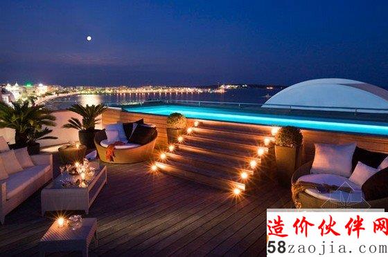 一个位于屋顶的游泳池令那些富有的避暑人士欢欣不已。然而这个游泳池并非这套顶层套房的唯一优势。马捷斯蒂克顶层套房还因为拥有出色的景观而与 众不同:客人能够欣赏到地中海、雷兰诸岛以及淡红色的埃斯泰雷尔山地(l&0#39;Est rel)上蔚为壮观的日落景致。家庭影院设施虽然不那么浪漫但却同样重要,这是一套高级视听设 施。自动屏幕与录像机相连,可以显示3米宽2米高的画面。虽说如此,但是高科技却并不排斥诗意。见证就是“体验淋浴”,这间感官淋浴房运用嗅觉、听觉、光 亮氛围将洗浴时间营造为宝贵的休闲时刻。简单的触碰即可设置氛围程序。你想选择“夏季风暴”程序?将置身于绿色光线中,沐浴在温暖的细雨下,被地中海森林 的气息所吸引,在聆听鸟儿的歌声之前还将听到雷鸣。你喜欢刺激感受?那就请选择“极地”程序:淡蓝色的照明伴着带有薄荷香气的冷水浴。绝对令人振作!