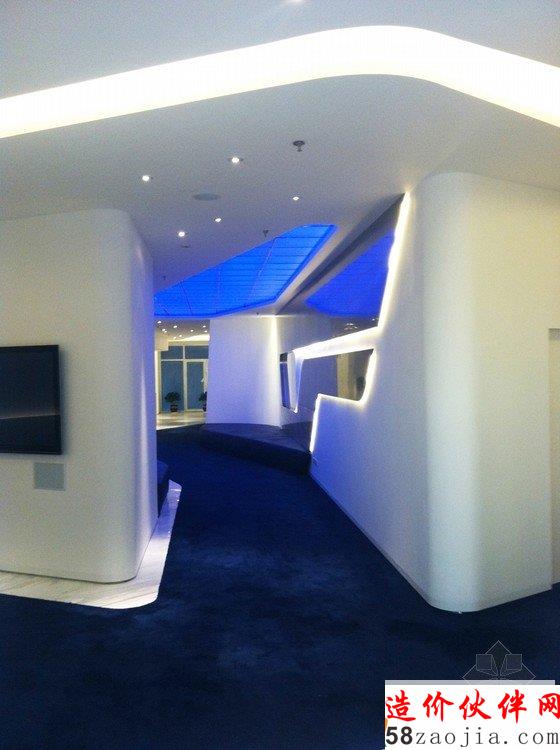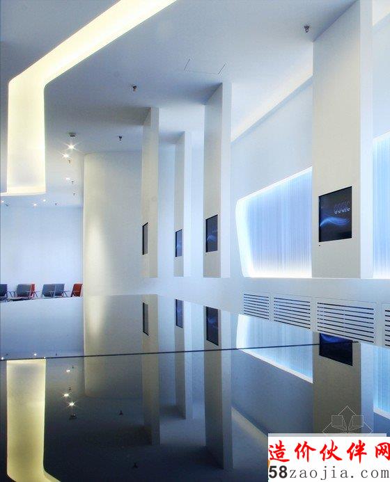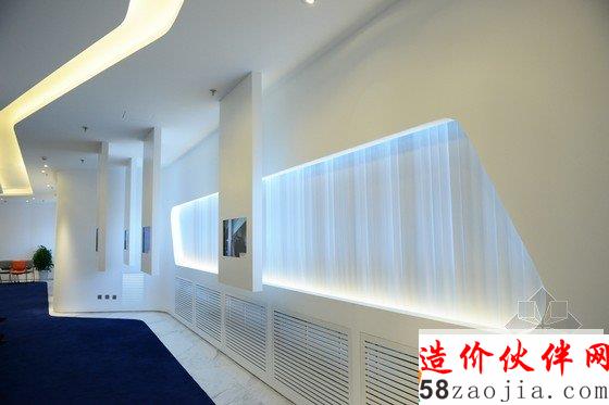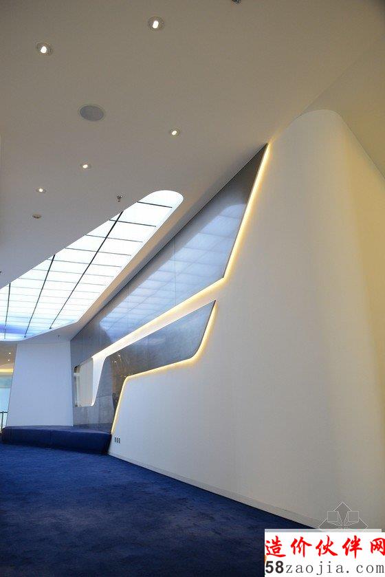 中德产业创新中心办公空间设计位于中国内蒙古,大约2000平方米,设计项目由AREA-17和德国Fraunhofer IAO研究院合作完成。中德产业创新中心办公空间室内设计的出发点是要营造一种全新模式的办公空间,一个能让人们在活跃创新的环境中工作、思考、会客、讨论、研究和交流的场所;同时,它又是人们工作之余休憩、养精蓄锐以待厚积薄发,有效获取信息、激发灵感的地方。这一设计思路的形成正是受启发于中国人阴阳相生、张弛有道的理念。整个空间被设计为9个区域,装饰主材采用白色大理石、从德国进口的蓝色地毯、以及部分不锈钢的产品,整个空间干净、纯粹。整体设计呈现出流线型的灵活可变空间,通过材料的应用和灯光效果的控制以及二者的融合与互动来体现设计细节。中央位置的天花被设计成LED天幕,其变色模块可根据不同的场合和需求营造出不同的氛围。