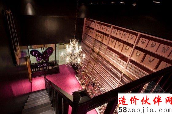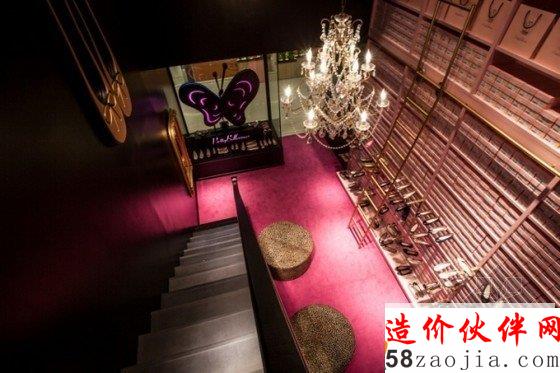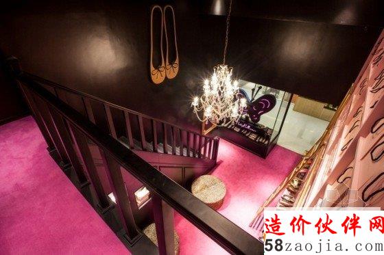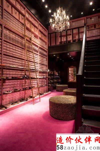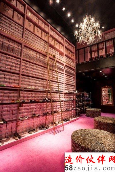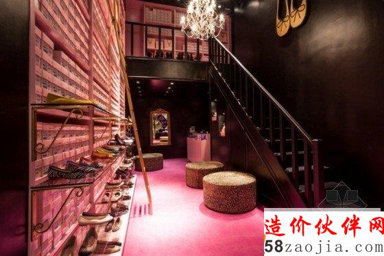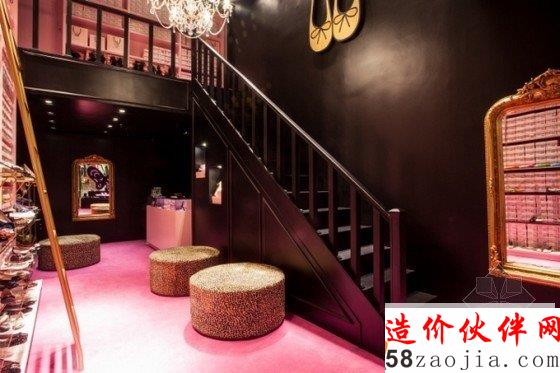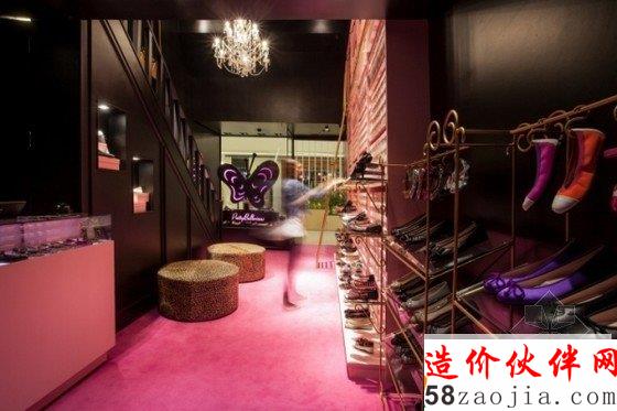 巴西Pretty Ballerinas芭蕾舞鞋专卖店商店的装修设计就像微型巧克力盒。有签名的法国古董镀金的镜子和吊灯,粉色的书架和豹纹沙发组合搭配对比强烈,芭蕾舞鞋专卖店装修个性大胆。