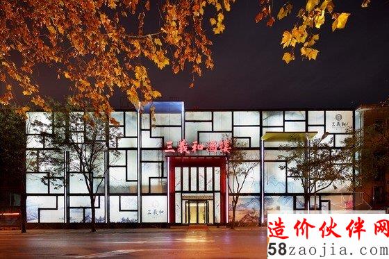 三義和酒楼的大厅和散座区以现代人追求简洁返璞归真的思想做为设计的发想。大厅主要运用麻绳,原木,瓷盘等淳朴材料,加入现代跳跃的彩绘手法,造成强烈的风格对比和视觉冲击,来彰显此空间的个性。散座区主要运用“静中求动”的思想。色彩上,大胆的运用中国的传统色彩之三绿色以及钛白色作为主色调,“强烈碰撞”作为提高整体空间个性和趣味性的一个重要手段。中心区域位置的墙面和天花用山水画书卷的形式,表达出行云流水延绵不断的效果。周遭更以黑色钢制长管灯和叠级灯光,来增加空间的趣味性和韵律感。宴会厅延续了散座区“静中求动”的思路,整体空间从天到墙再到地面,进行了不规则的分割。包房区,运用传统的中式色调及元素,以现代优雅不乏奢华的方式呈现。这个东方韵味十足的餐饮空间,取其“依循传统”之意,蕴含着不可言喻的东方气息,该餐厅的改造设计也因此赢的了经营发展上的极大成功,是全新中国文化的代表作。