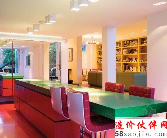 色彩缤纷的别墅装修设计,位于伦敦西部的一座别墅,巨大的落地窗,使得满满的阳光能完全的洒落进来,设计师把每个空间都设置了一种颜色,利用色彩来划分空间,明亮、俏皮却不庸俗的色彩搭配,使得每一天都会充满活力和新鲜感。