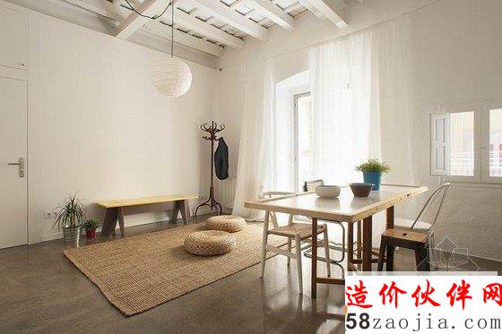 巴塞罗那一座清新公寓装修,纯白的墙壁,被刷白的木质屋顶,原木色的木质家具,没有多余的色彩和丰富的配饰,一切看起来都已经简单到了极致,编制的垫子和蒲团又带有一些别样的韵味,连门的没有的开放式空间,会带来很大的随意感,似乎在这个空间,唯一能做的就是无拘无束。清新简约公寓装修设计,随意无处不在。
