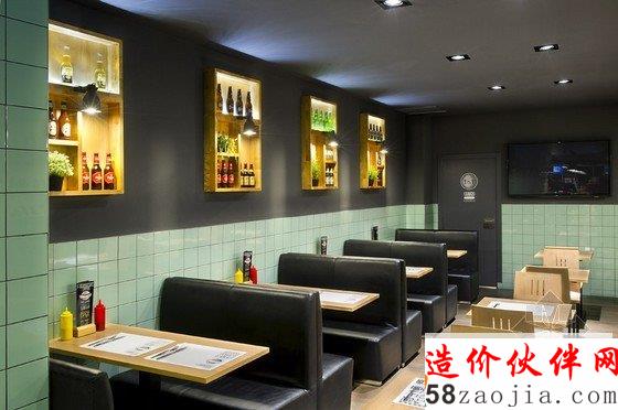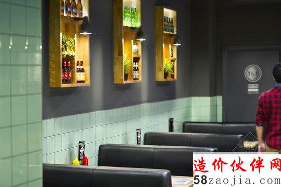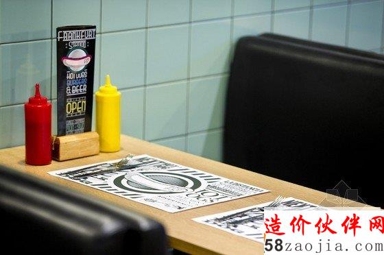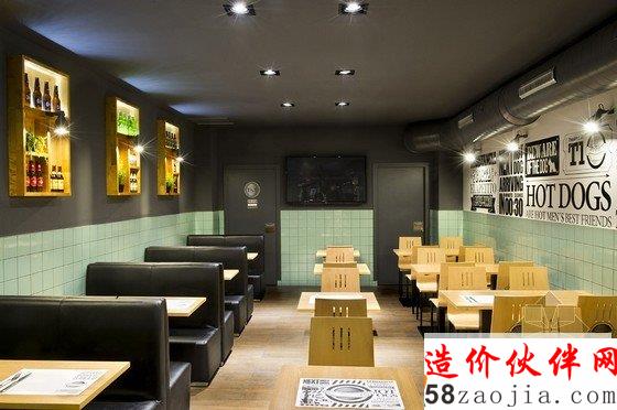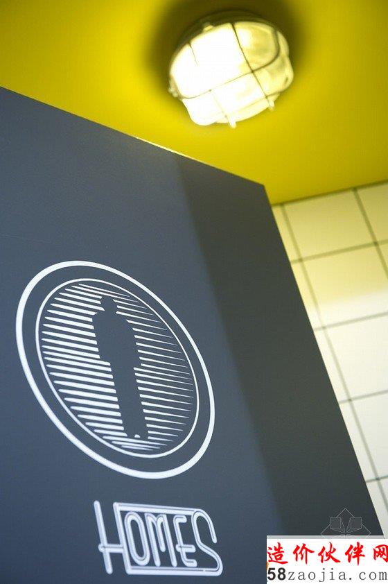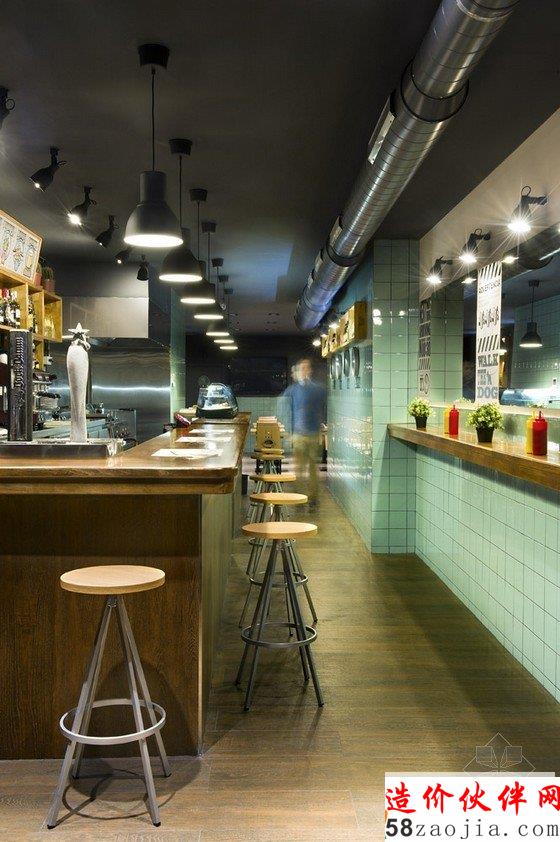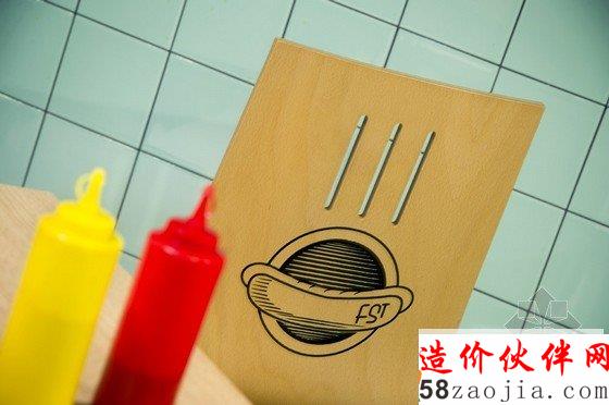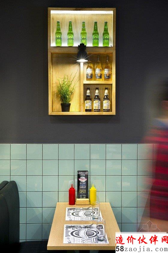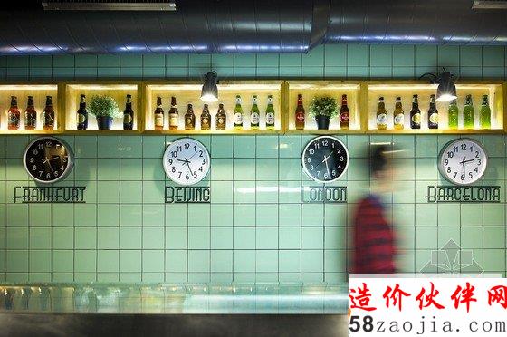 单词”Frankfurt”不仅仅是城市名称,还是一种香肠的名字,它同时结合了美食与旅游的乐趣体验,基于这个因素,客户希望给餐厅创建一个简单却令人印象深刻的名字,西班牙设计工作室 Denys & von Arend 的设计师 Daniel Pérez与Felipe Araujo受邀为这个位于巴塞罗那 Creu Cuberta街的餐厅设计内部空间,”Frankfurt Station”不仅仅是餐厅的名字,同时也作为整个设计过程中的概念指导。法兰克福车站餐厅内部是细长的空间,设计师在入口一侧设置吧台,只有几英尺宽度的过道仿佛是车站月台,吧台背墙上的钟表显示着不同城市的时间,同时这里也作为食品的准备和供应功能。在内部的用餐区,客人座位是经典的火车坐形式,在每一个座位单元中心墙面的置物架上装点着绿色植物。通过这个小窗口,旅行者并不能欣赏风景而是浏览啤酒的世界。如果说跃上这趟列车就相当于“以最快捷的方式得到美食的享受”,而该室内设计方案则代表了最具成本效益的方式。诠释“优质低价”的概念,设计师采用低成本易于维护的墙面处理方式,而独到的颜色搭配与拼装方式的组合更加传达出热情的氛围。