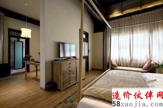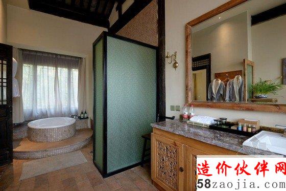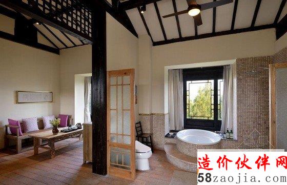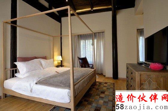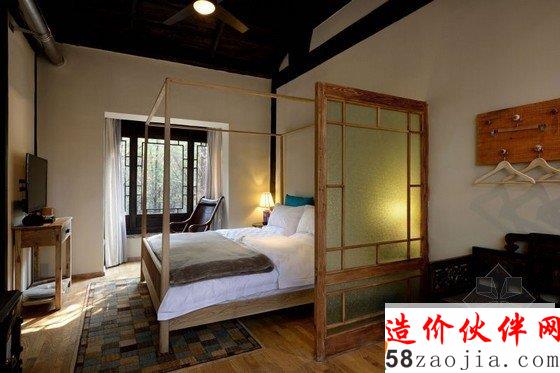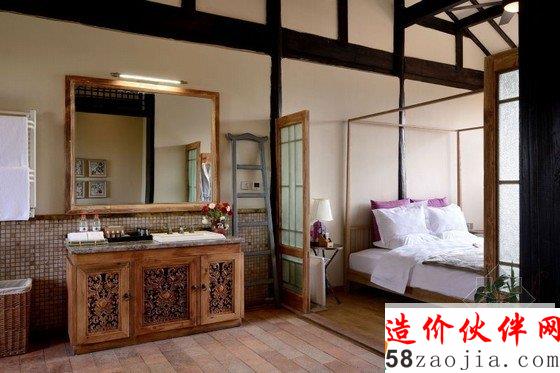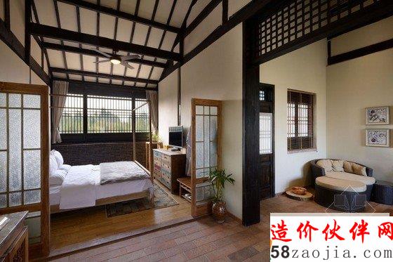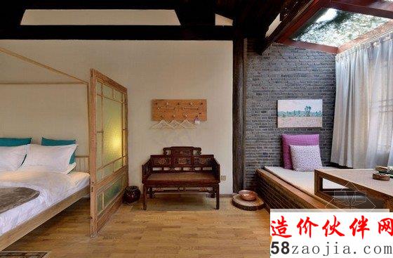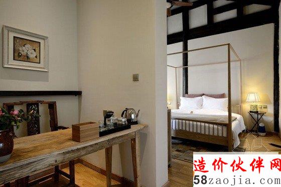 丽江花间堂问云山庄客房名取自金陵十二钗,装饰也各不相同,因在二楼的关系,远处雪山在清晨尤为俊秀,古城的青砖灰瓦则在你眼下呈平面铺开,喧嚣被窗外随摇动的松树尖挡住。纵向上,天花是极高的,目测近6米。打开窗,让空气对流,山顶的假期相当环保。横向上,室内粗分为三个区,客厅、洗漱、卧室, 原木家具来自丽江当地的一位台湾设计师,用来插花的各色瓦罐可在忠义市场买到;房外有独用书桌,回廊可坐着发呆、喝茶、抚琴。室内空间之间少有阻隔,目的是显得通透。
