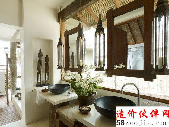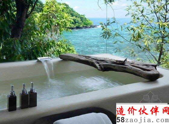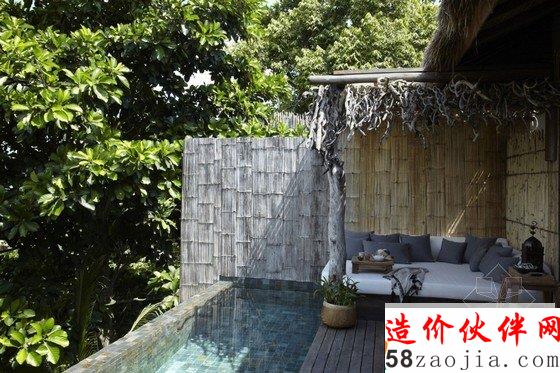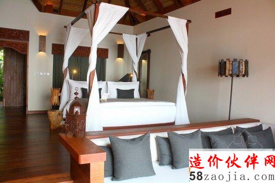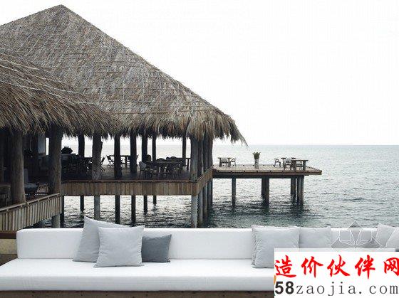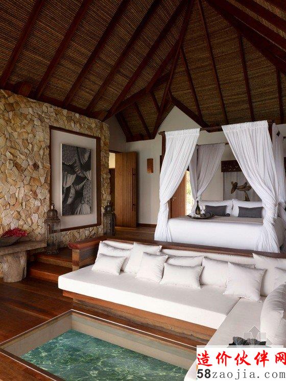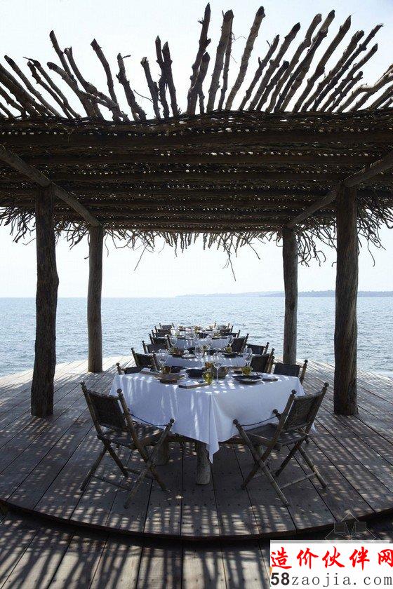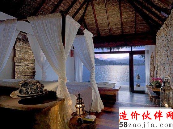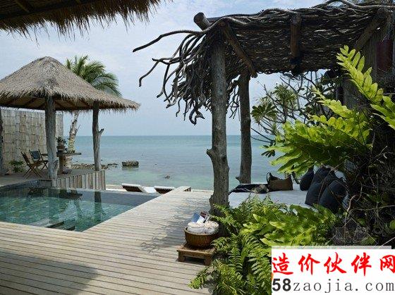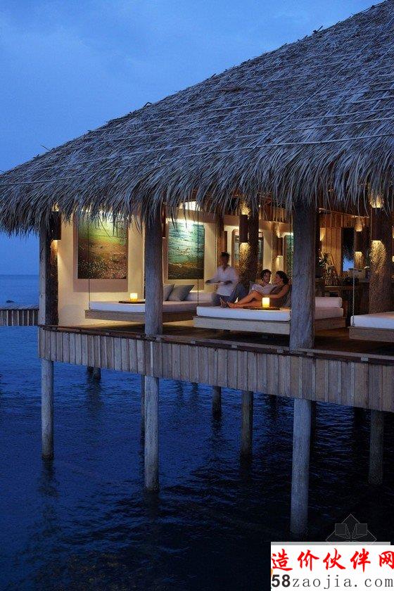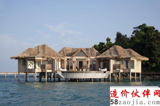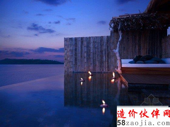这座度假村位于柬埔寨Song Saa岛,蓝绿相间的海平面上,散落着一排茅草屋顶别墅,不远处的海岛群郁郁葱葱,如天然宝石般煜煜夺目。整个度假村的建筑灵感便源自当地渔村,外部采用传统的茅草屋风格搭建,内部墙壁使用大量当地砂岩堆砌而成,房间里的家具和饰品几乎全部采用废旧渔船和漂流木制成,废旧老渔船木料制成的木柜和坐凳,废铁做成的多彩吊灯和壁灯,轻纱幔帐的简易木床,室内家具和摆设同样质朴而简约,开放式的空间布局将室内与大海的美景连在一起,将豪华和舒适寓于天然和粗糙之中。一座蜿蜒的木桥将几座矗立在大海之中的圆形木屋相连,可以让人站在大海中享受美梦。作为柬埔寨首个私人岛屿度假村,Song Saa的私密奢华可以与许多海岛度假酒店相媲美。