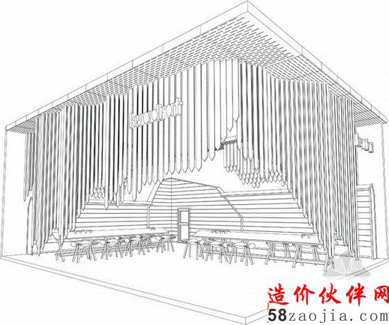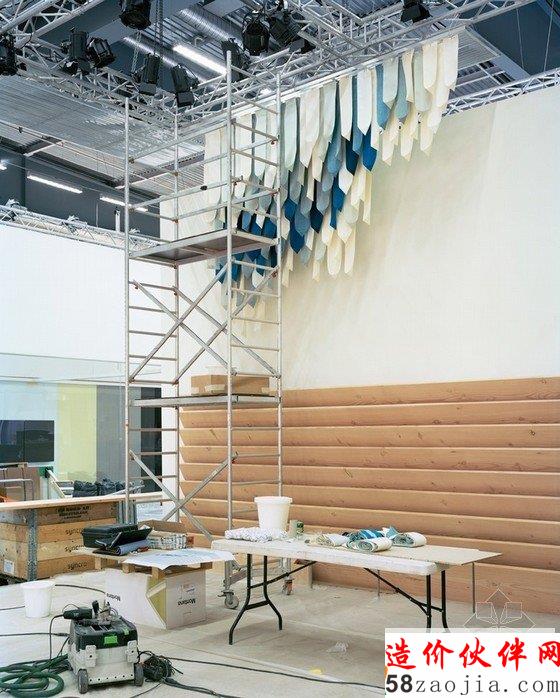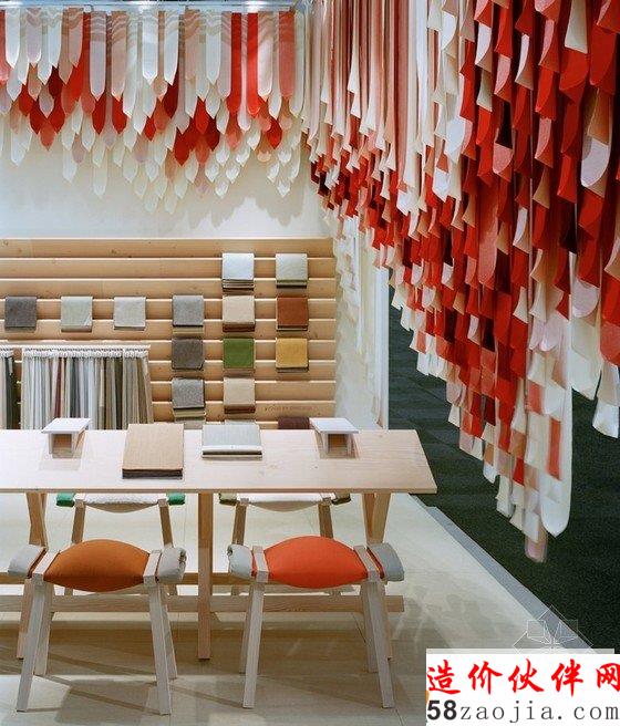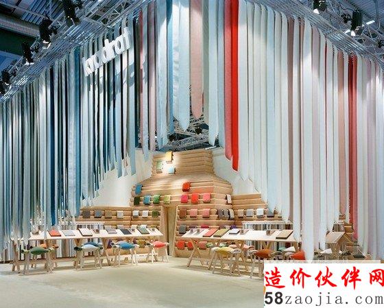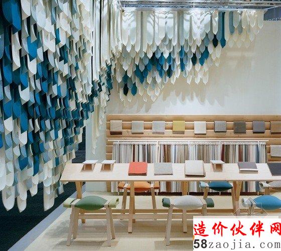 设计师的灵感来自一种叫byweeping柳树,它们巨大足以区隔私密空间。于是设计师挑选了20款不同色彩的Kvadrat纺织品,制成1500条彩带,在空中错路有致的悬挂起来,模拟春天的垂柳;展厅内部用原生态的木板制作成木屋的屋顶和野餐的木凳来展示布样,变幻成一个超现实充满轻松意味的魔法森林,美妙至极。