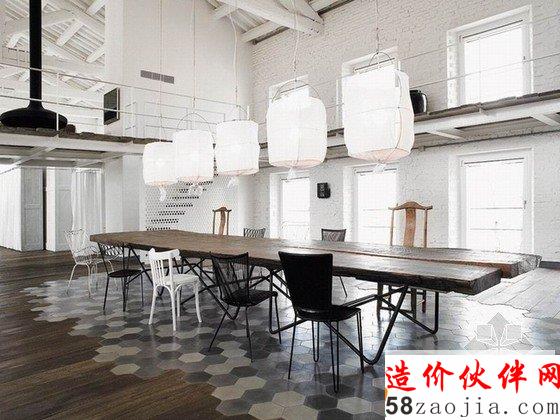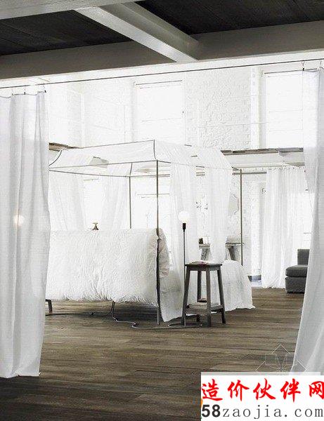 现代乡村风格loft住宅,是一个单一的大型空间,为了不那么空旷,需要一些独特的元素来点亮设计。火车为灵感的茶几、纸糊般的吊灯、拼接的衫木地板与水泥砖、悬浮壁炉、没有两把是相同的椅子……白色的复古式大床简约至极,却又极致的浪漫梦幻。每个元素都运用的随心所欲,很融洽地就那么出现了。