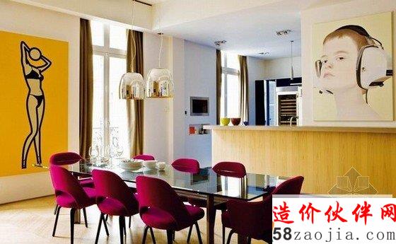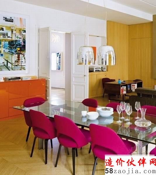这座公寓位于法国巴黎,巴黎公寓设计,空间充满艺术气息。淡色木质地板配上了深灰色的沙发,优雅的蓝色座椅,显得舒适自然优雅,硬朗的厨房带着工业色彩,当艳丽的紫红色餐椅出现的时候,带来了时尚和活力,卧室则以简洁明快为主,主人是个艺术爱好者,所以家中多处都挂着充满艺术感的挂画,给整个空间带来艺术气息。