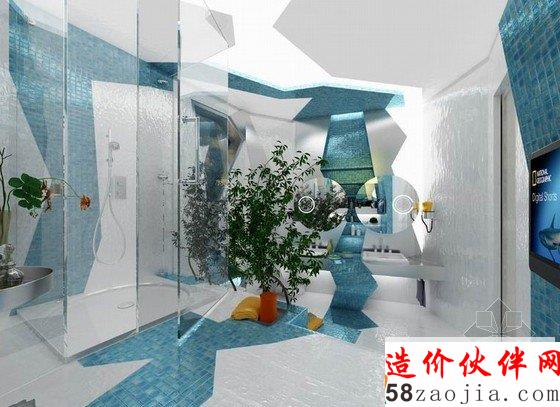 设计师为这两个浴室的命名也很有趣,蓝白相间的浴室名字叫“几何H2O”,而黄色紫色混搭的那间则叫“绿洲的沙尘暴”。众所周知,水是浴室最重要的元素,受到这个启发设计师打造了“几何H2O”。蓝色的马赛克以几何平面的形式横跨了整个空间,曲折蜿蜒,如同置身于被光线照射的水底。这些曲折的视觉同时也拓展了空间,在这个浴室甚至还装饰了书架和绿色植物,增加了浴室的趣味性。