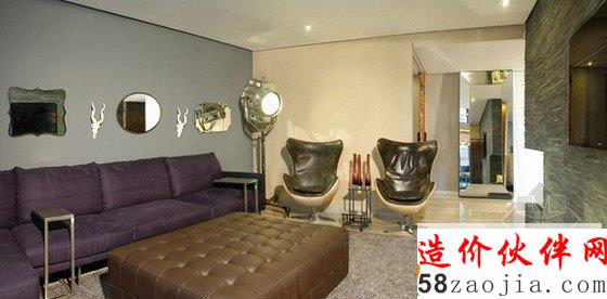 墨西哥Vidalta公寓设计,公寓进门处深橘色的隔断很是抢眼,很少有家庭会用到如此深重的颜色,配合复古的配饰,似乎能感受到拉丁美洲热情的氛围。为了减少深橘色带来的冲击,客厅则选用了灰色的墙壁,紫色的沙发,皮质的座椅和茶几又是浓厚的美式风味,宽敞大气的餐厅座椅则选用了黑色,带来成熟质感,三个不同类型的卧室则以简约为主。整个家弥漫着复古美式和现代的融合。