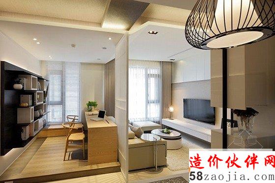 本案是一个一居室的小户型,属于复合混搭风格。空间高度集中,吊顶、隔断、材质的变化将区域划分的很明确,面积虽然小却充满层次感,不凌乱也不平庸。隔出的一片书房意境优雅,很明显的有放缓生活节奏的功效。浅色调的客厅显得空间更大,怡情舒适,卧室的设计则增添了阳刚的气质,感性与理性交融。