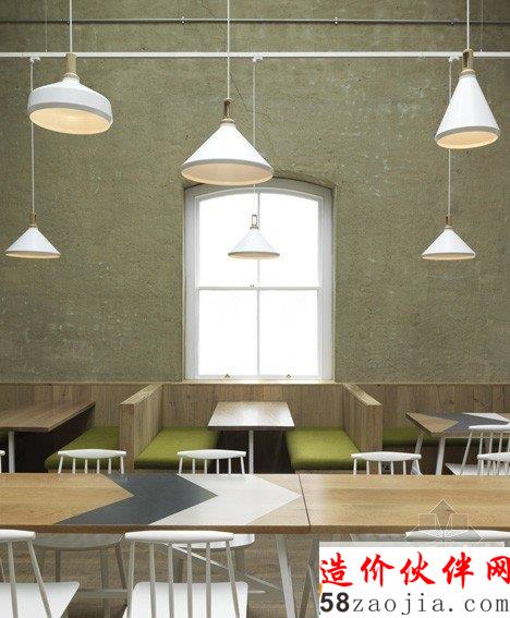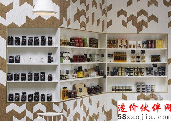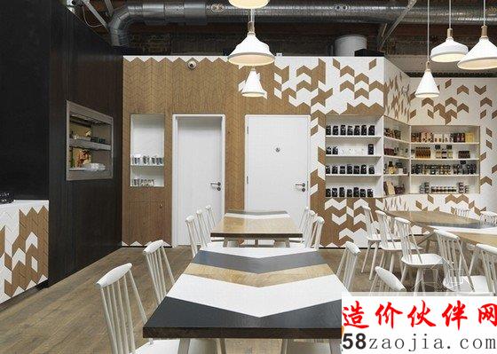 伦敦的皇家阿森纳滨江边,该地区有着兵工厂的历史传统,咖啡厅的前身也是一个供应军品的仓库,所以Paul Crofts工作室采用了与军装有联系的雪佛龙图案作为空间的主要元素。柜台覆盖着咖啡牛奶色调的人字形拼接木板,桌椅布置简洁清爽,轻快的调调弥漫整个店面。