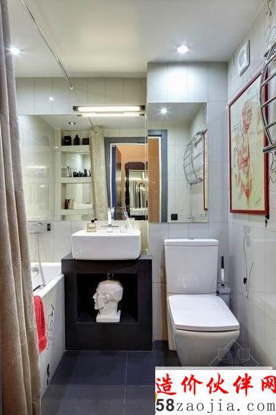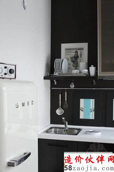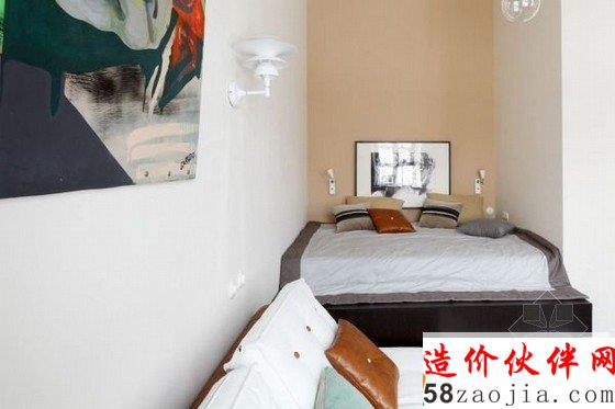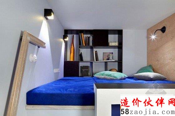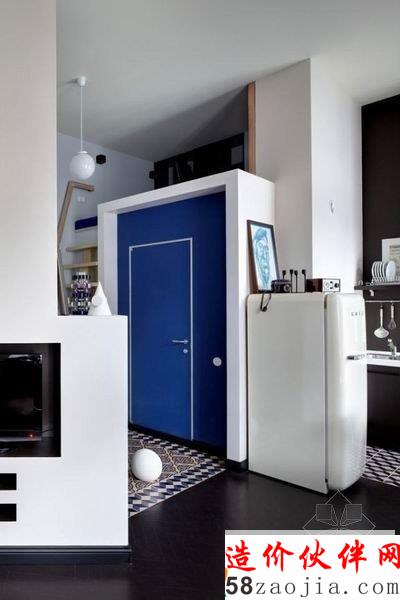 创意十足的阁楼公寓设计,入口处的一座木制简易楼梯上去安置了一床床铺,而下面的蓝色门则是洗手间,充分利用了空间,鉴于面积原因,厨房与客厅餐厅形成了开放式的空间,卧室也在厚厚的墙壁转角里,整个公寓选择了多件特别的艺术品配饰,显得十分的与众不同。