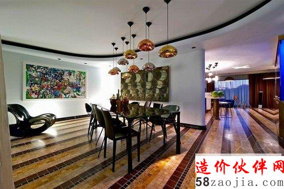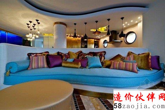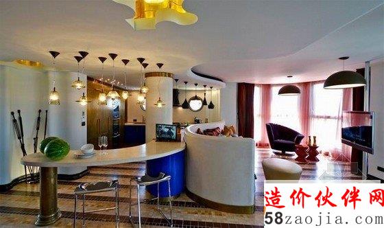 客厅的设计根据户型而定,客厅的户型带着轻微的弧度,所以在设计上,不论是天花板,沙发或者是餐桌都有一种柔美的线条弧度感,多展出彩的灯具,超多的配饰,软装硬装兼具时尚与古典,各个卧室的装修则是华美的宫廷气息。