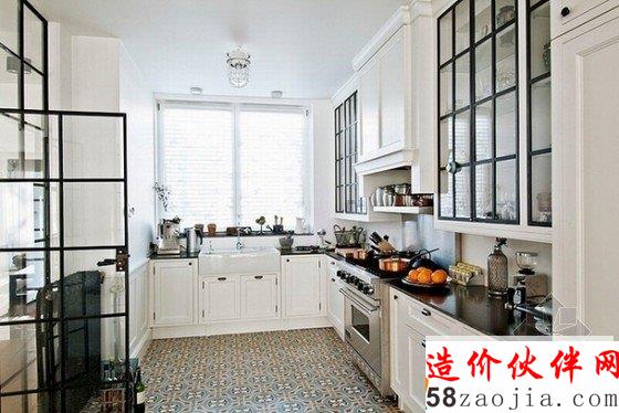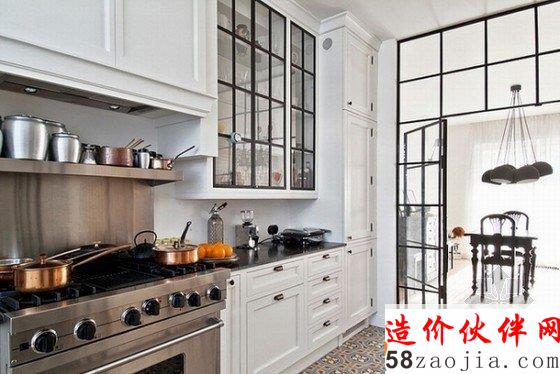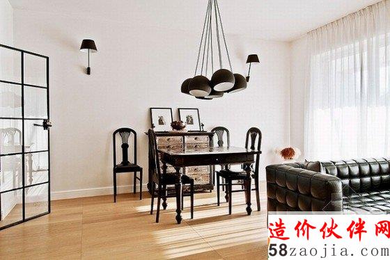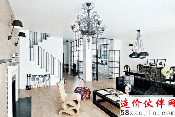 主要设计元素是黑色线条,无论是大门、厨房门、楼梯扶手,还是吊灯、茶几、柜门,都延续统一了这个风格,在白色的背景下,明黑的线条显得十分气质优雅,将古典融于现代,仿佛黑白老电影一样回味悠长。