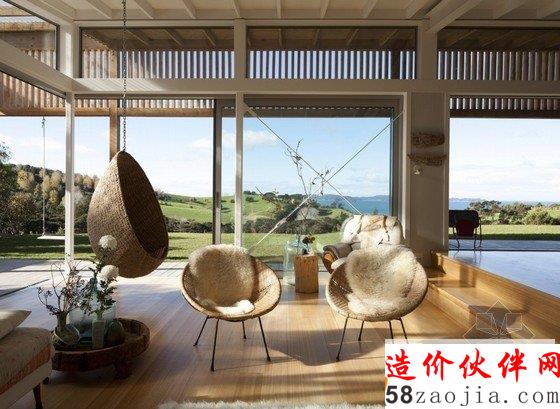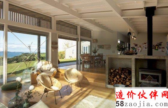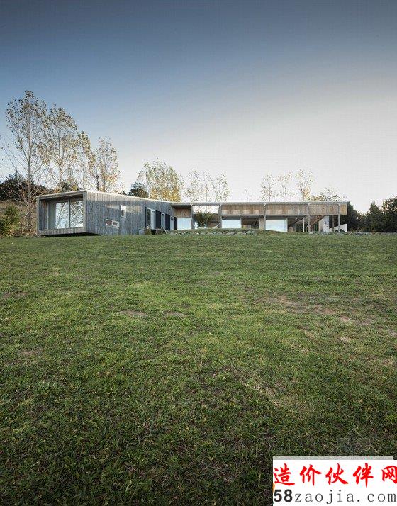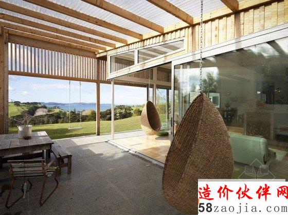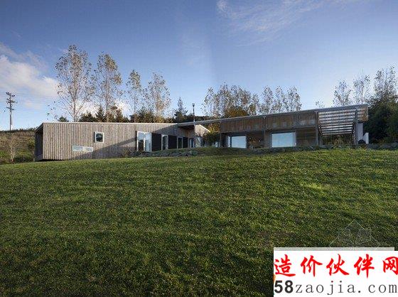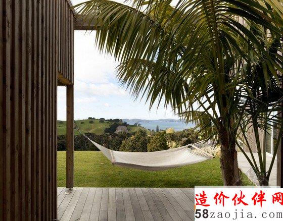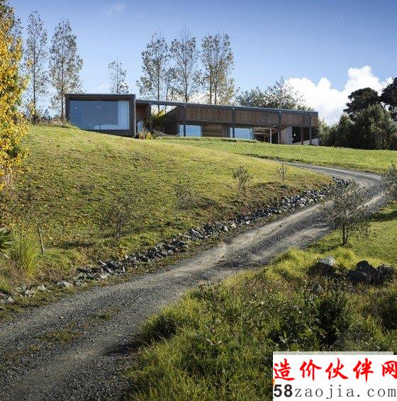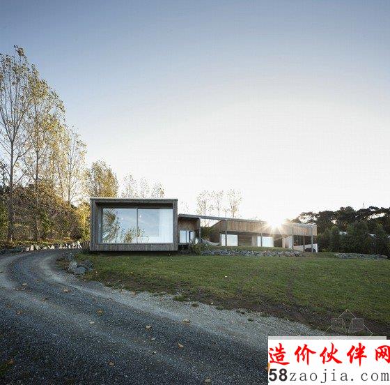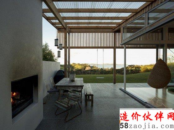这所住宅是为一个五口之家准备的,按照户主的要求,设计师将该项目的位置设计在乡村与城市的接壤地带。房子坐落在距离海滩2公里的高地上,沿路的西边分布。在那里可以看到远方美丽的海景;同时还可以感觉到乡村的宁静气息。该住房内有一个大的庭院,周围有南边的山地为保。L形的设计将房屋内与外相阻隔,阻断了街边车来车往的噪声污染,给予住户足够的隐私保护。北边的房屋在东边和西边各有一个窗户,午后的阳光可以顺着玻璃摄入室内。在开放的三角屋顶的门廊下有一个大飘窗,从内可以看到外面的Kawau湾的景色。整个别墅的窗户采用了百叶窗板,在夏季可以提供阴凉,在冬季还可以有保暖的效果。