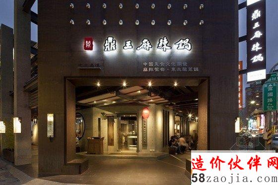 高雄鼎王麻辣锅餐厅设计分为外观造型和室内两大部分,外观入口处依鼎的形状转换为具有气势的牌楼造型,修饰三角窗会出现的直角面,又因基地环境处于正西晒问题,故选择与风格极为搭调的屋瓦来阻挡部份日照。室内则运用手法如飞梁、屏风、折墙、格栅与地坪转换,营造空间层次。