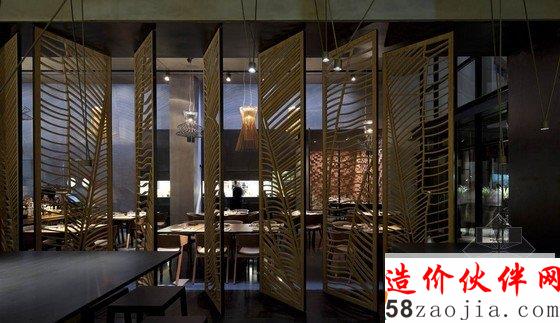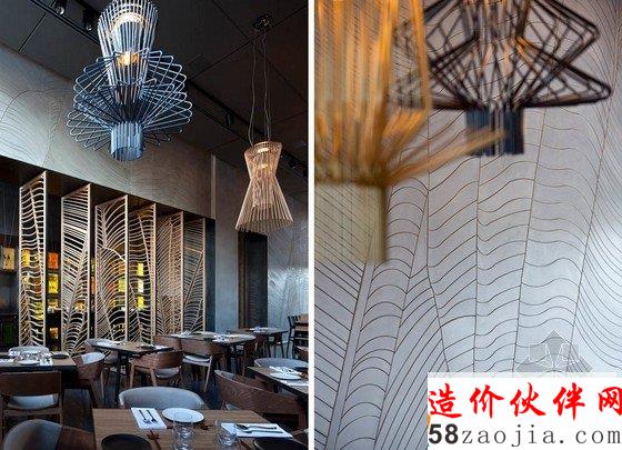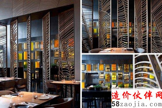 摘要:以色列太祖亚洲餐厅,设计根源中国五行学说金木水火土以及餐厅的料理特色。内部运用芭蕉叶图案做旋转屏风图案和墙面机理。旋转屏风可以将空间分隔,不过屏风的通透并未完全切断他们的联系。