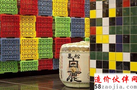 澳大利亚悉尼Sushizilla餐厅室内马赛克图案和亮色餐椅十分的跳跃,部分隔间被做成了火车内车厢座位的情景,墙上的手绘漫画来自于--Siori Kitajima,不得不说的还有被染色的废弃牛奶箱,经过排列设计,充满创意。