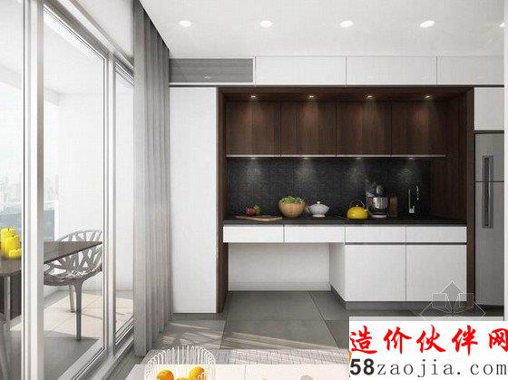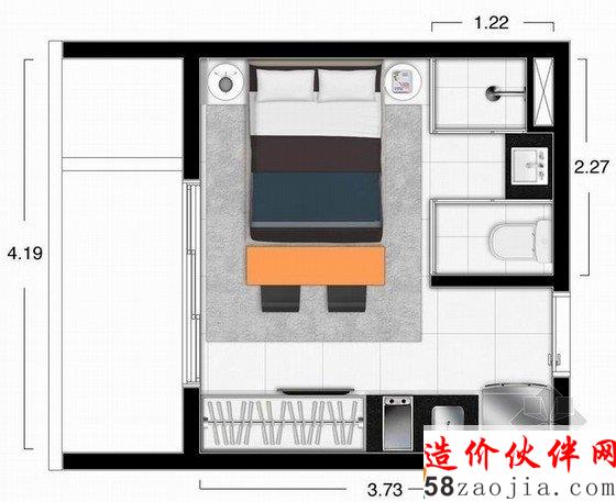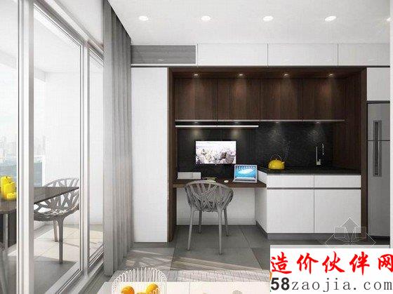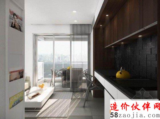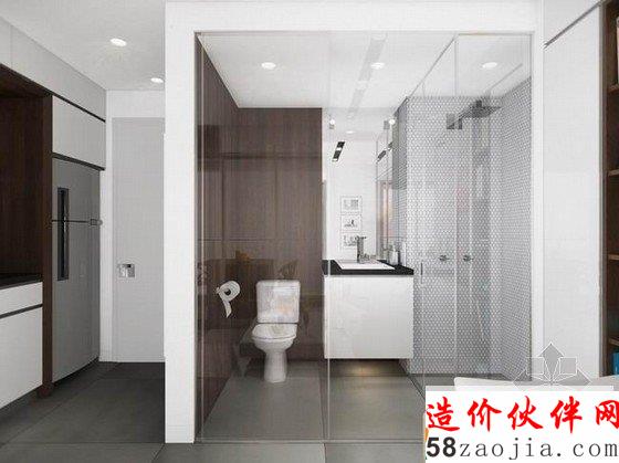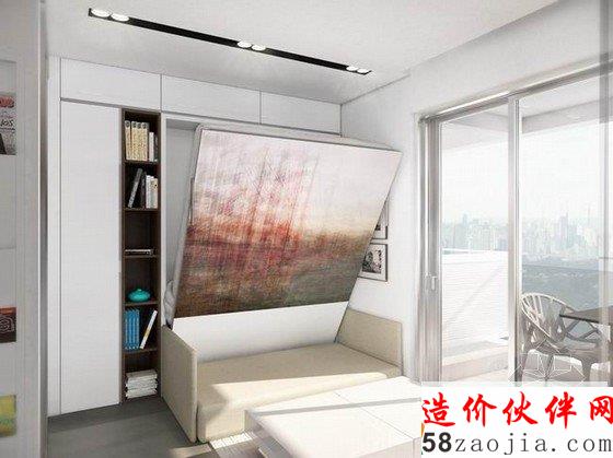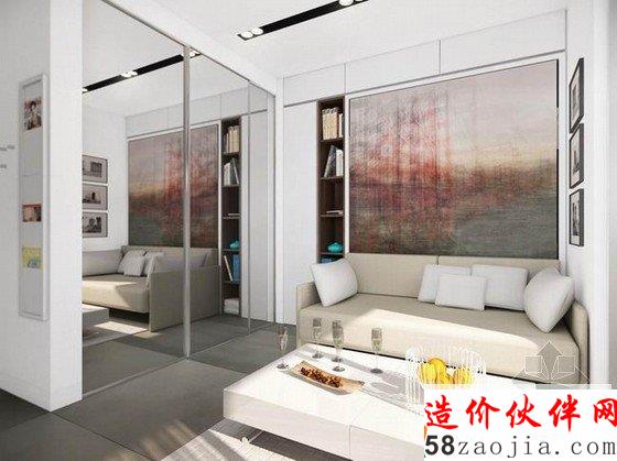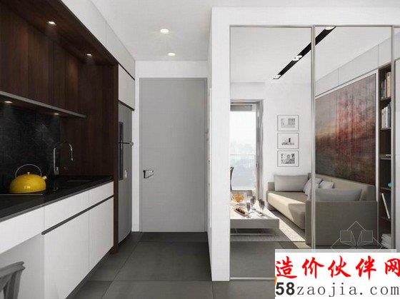 19平米公寓装修设计,白色的茶几当朋友来家中小聚时,可安置于沙发扶手上,作为多人餐桌,而夜晚,镶嵌于墙体内的床则可放下,茶几则作为了床的称重架,甚至是看似简单的厨房,摇身一变,便是主人的办公桌,而卫生间的隔断则用玻璃镜代替,扩大视野范围。