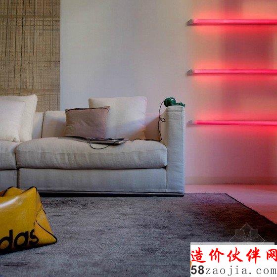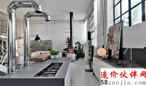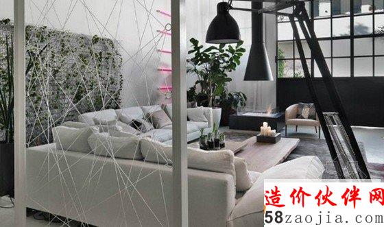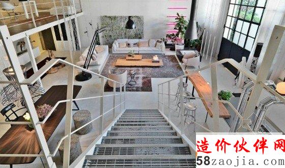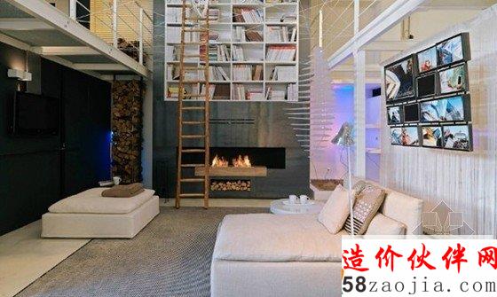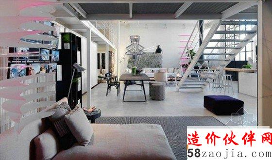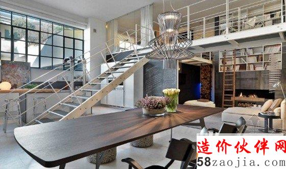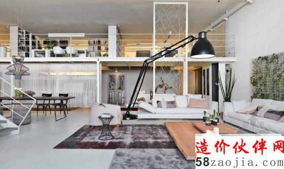loft家居装修设计,罕见的巨型台灯式落地灯与别致的壁炉颇具个性与张力,家具造型多变,这里没有循规蹈矩的物件。轻工业风被运用的自然清爽,毫不做作。