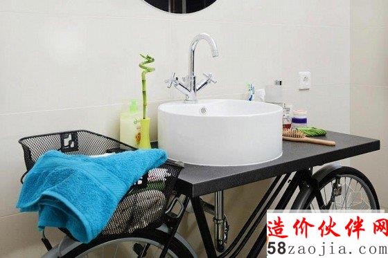 主人巧妙的利用镂空隔断,在分隔区域的同时增加视野的宽广性和储物性,家居装饰设计简单、空间明亮,自行车的洗手台也是亮点。