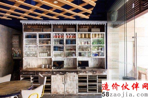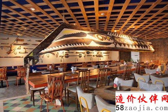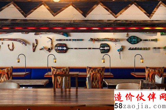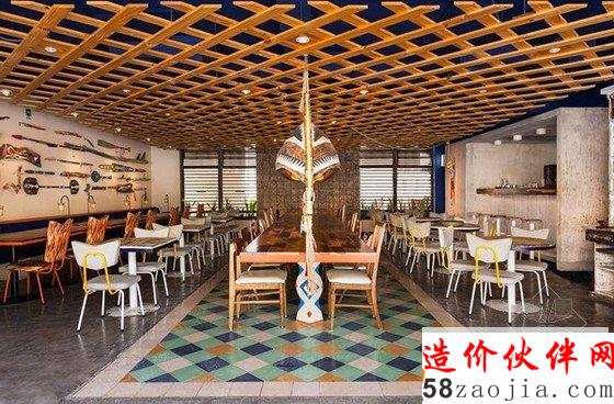独特的墨西哥卡门海滩酒吧装修设计,长条形餐桌的顶上是独木舟,将灯具安置在里面,这样独特的设计让人大为惊叹,古旧的木质象征着原始又复古的部落,将部落赖以生存的大自然融入到整个设计中。