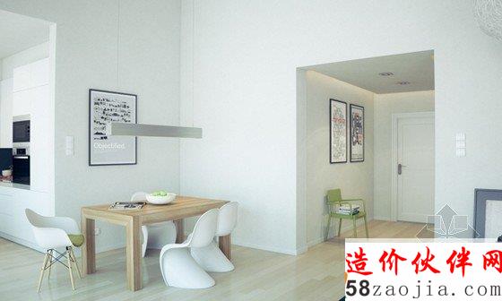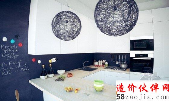 简约公寓室内生活空间,简约内饰,有来自于厨房,创建的方便音符墙磁性油漆黑板,这里方便你涂下购物清单,制定出每周的时间表或家人提醒。书写区外的厨房设备都成直角,早餐吧利用了主要的空间,可以俯瞰屋外的聪聪绿意。