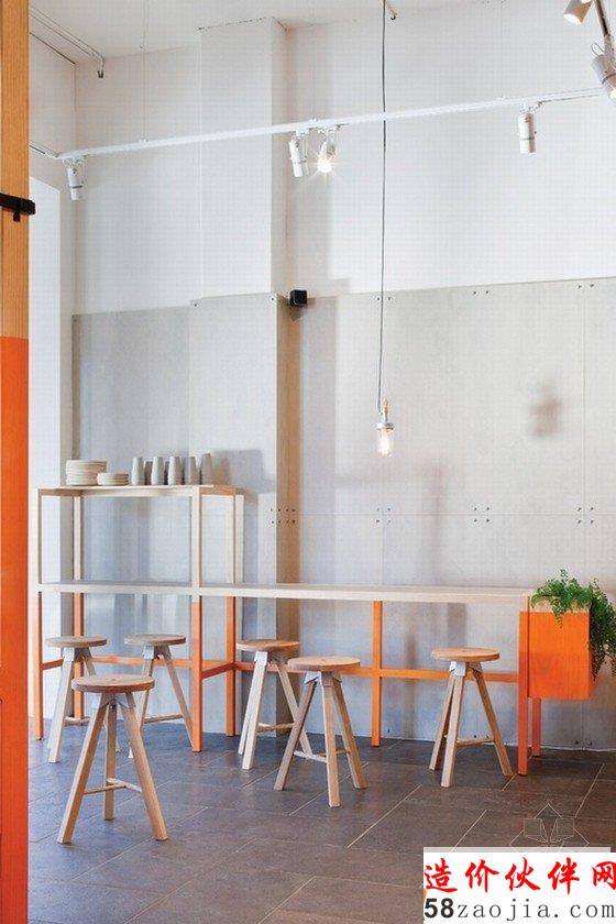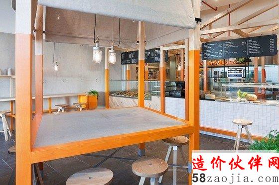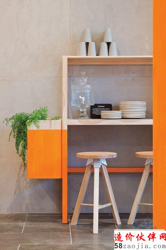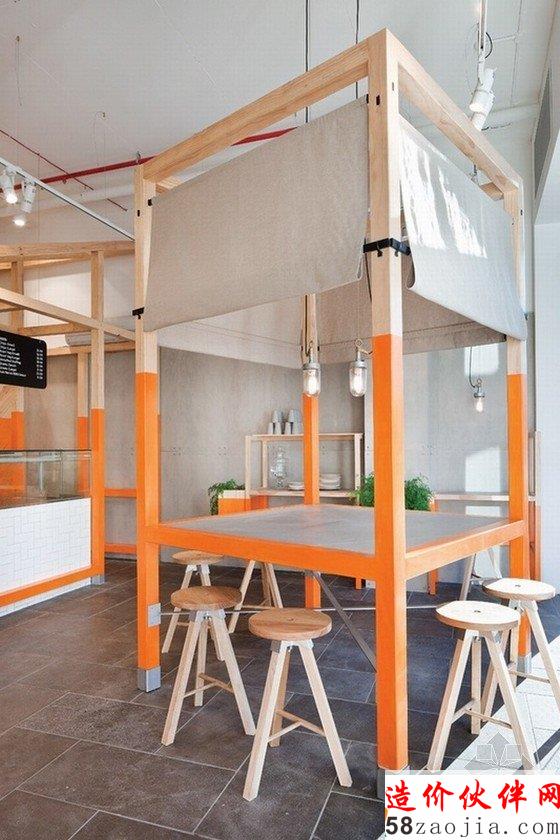 这家位于墨尔本的快餐厅名为狐狸小屋(Foxes Den cafe),名字由来于一只常常从鸡窝顺手牵“鸡”的偷鸡狐狸。因此室内设计师Hecker Guthrie围绕这一主题进行了设计。木质的结构搭建出类似鸡窝与农舍的造型,厨房,服务台甚至就餐区全部被“圈住”。