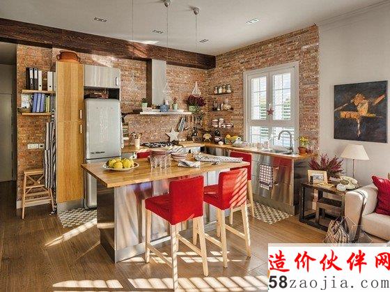 这是间非常漂亮的公寓,开放式设计,厨房整面墙都是红砖,砖墙搭配不锈钢,色调非常好看。客厅则是米灰色墙壁,简洁的转角沙发和复古的茶几搭配十分和谐,沙发的红色系抱枕与高脚凳呼应,红色成为空间的点缀色。卧室采用清爽的灰白海军风条纹,格调宜人。