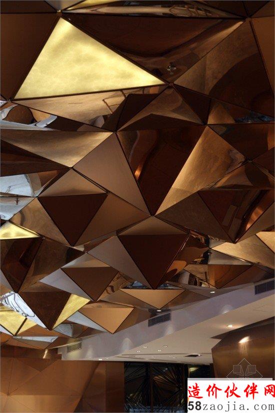 室内体块表皮的三角形设计元素的选择来自于对建筑外观表皮的尊重和深入演绎。在原建筑设计中,三角形的组合作为整体商业外墙部分的组成元素,在商场和商业街的表皮上占有绝对的面积,形成了强烈的地标识别的视觉形象。在内部空间的设计中,设计师首先把立面进行整合,把“线”组合成“面”,把“面”组合成“块”。主要的“块”构成了空间的“场”,不同的体块赋予了空间不同的个性。其中两个主要背景体块的设计灵感来自于抽象的几何山水作品。将自然界中的山水平面抽象简化成三角形组合的线条,再进一步将线条立体化,使其有一种类似木质传统瓦片的层叠组合关系。柱子和另一部分体块则将三角行排列组合成立方体,并赋予了其金属材质。“面”的表现形式则是“屏”,通过“屏”来增强空间的围合感,强化整体室内的“场”。三种同源而不同型的体块在材料运用上分别选择了木材、金属、光影三种不同性质的材料,令“场”中的对话感更强。