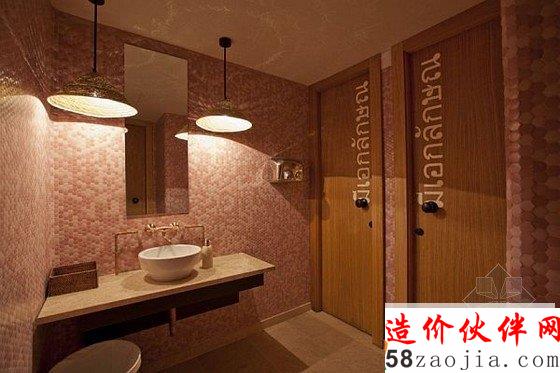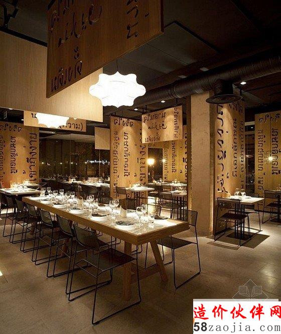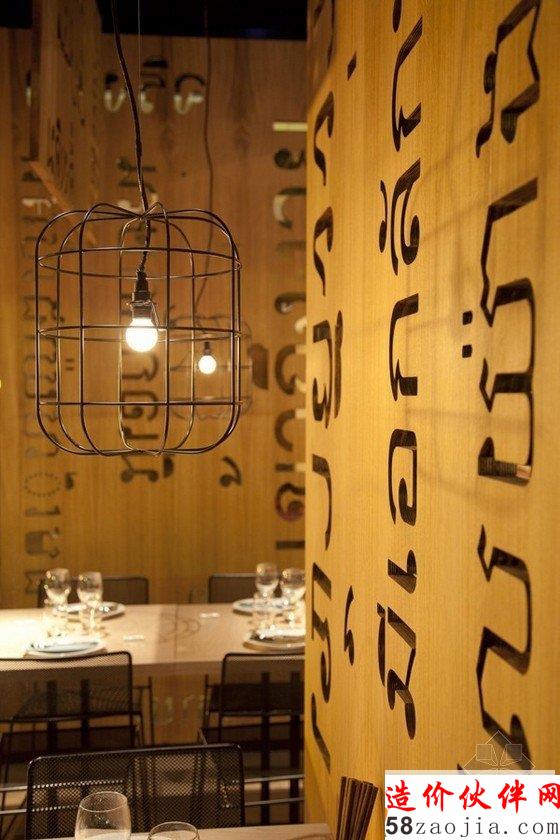 餐厅的室内设计由 ILMIODESIGN 设计工作室承担,设计师希望打造出一个没有任何中国或日本餐厅经典设计元素装点而与众不同的异国风情餐厅。为达到此目的,设计师计划对餐厅空间进行一次不同寻常的重新布局。设计师利用棕黄色木板作为空间划分的主导元素,通过悬垂木板、将木板固定在地板上或倚靠墙面从而构成各种隔断,将主体空间巧妙地划分为各个小区域,每个小的用餐区都能营造出一种略有不同却同样亲密、舒适的用餐氛围。这些木板结构不禁让人想到亚洲城市街道中杂乱无序的老式广告牌,设计师通过将它们进行统一规划和有序排列,打造了一个繁复而不凌乱、厚重而不压抑的用餐空间。