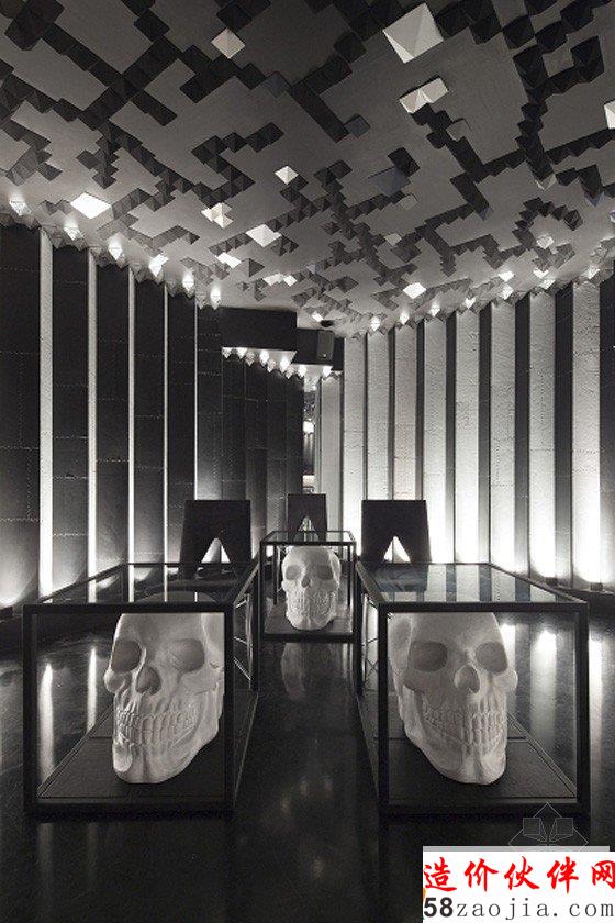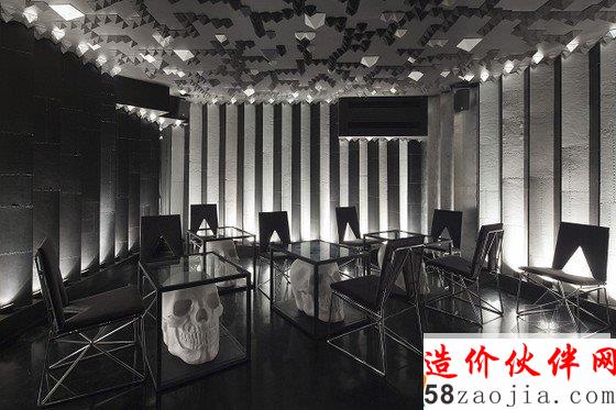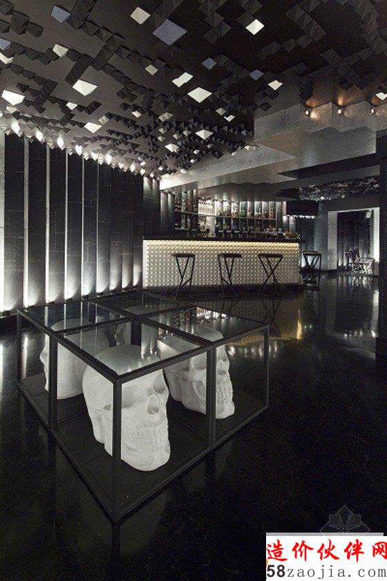 项目在墙壁、地面和天花中较多地使用了黑色与白色的铆钉皮革、银质金属片和木材等材料,使得地下室的布局变得开放。天花板上有许多金字塔状的装饰,让人不禁想起玛雅人奉为神圣之树的木棉树树干。这些装饰将外部世界与地下室空间联系起来,悬于骷髅头骨上,形成一个神圣的拱形结构。地下项目中陈腐的空间、废水管道、水泵房、水箱、冷却系统、横梁和柱子等都是打造极具雅致风格酒吧中非常棘手的元素。面对这样的地下项目,设计师巧妙地将项目的局限转化为优点。地下室原本布满了各种电线管道、污水管、水泵房、储水箱、制冷系统以及建筑的梁柱结构,设计师因地制宜将空间中建筑结构和水电管道等限制的因素转化为项目中的装饰亮点,利用自然质朴的木质楼梯中汲取元素,隐藏一些局限,保留了原有结构中的木质楼梯,从而为客人改造了一个由冷藏室进入酒吧的独特入口。