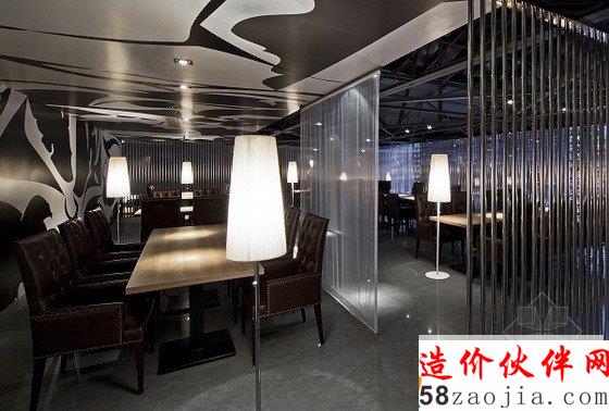 设计是将传统的牛排屋餐饮体验提升到一种新的境界。餐厅的两个用餐区内多种类型座位的布局迎合不同顾客的要求,在这时尚而浪漫的意境中享用锯扒之乐。中庭用餐区保留原有旧建筑的元素,包括十米高屋顶的斜面天窗和梁柱结构、外墙红砖和室内水泥壁以及窗框等,使顾客可以一边进食一边欣赏老建筑的新面貌。两米高的雄牛屏风用刀叉组成,它是餐厅的品牌标志,使顾客一见顿生食欲。区内垂直宽敞的空间里,六米高镜钢酒柜和VIP区顶上的水晶吊灯是装饰重点,中央和周围用餐区摆着真皮梳化,天花垂吊着紫红色光纤造成的点点星光,缀成了星光下的晚宴。夹层用餐区的钢结构夹层是半开放式。其多功能区的黑白牛图案吊顶和地灯令人有宾至如归之感。半透明的活动屏风装置提供灵活的间隔,以便满足举行不同的活动需要。