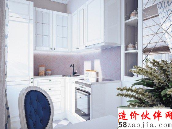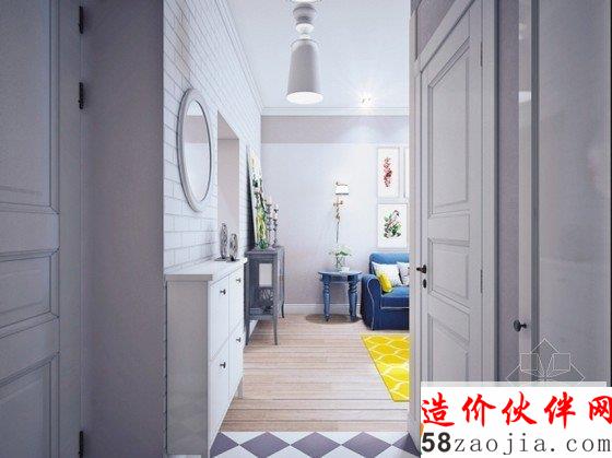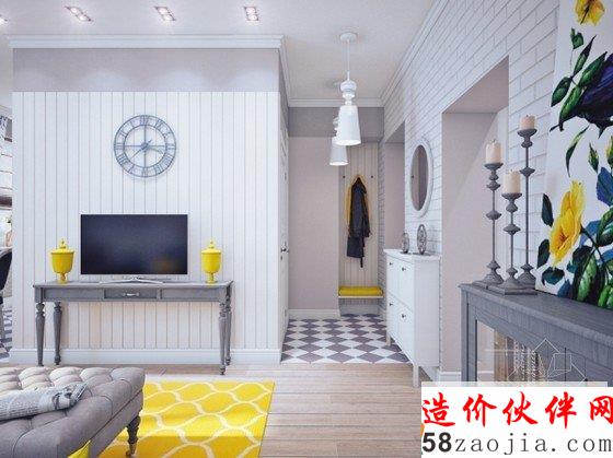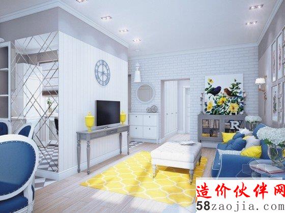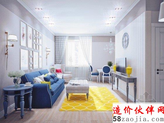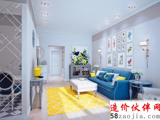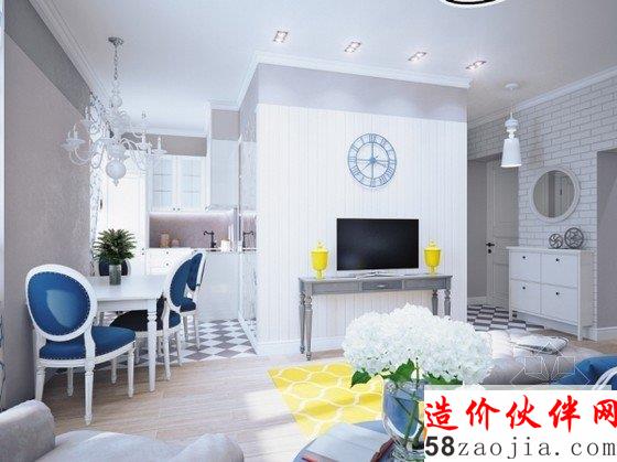 这套家居装饰设计的由Alina Puzhak完成,在浅色背景下,熟练的运用了多种彩色。墙壁被刷成浅蓝色,深蓝色沙发和黄色地毯格外抢眼,加上一张张色彩斑斓的壁画,顿显居室的灵动美,给人一种春天降临的活力感。设计师在不破坏空间完整性的情况下,运用灯光、地板结合墙体分隔出客厅、餐厅、厨房三块功能性区域,节省空间,避免居室冗杂。大面积玻璃窗,视野开阔,采光效果好。双层窗帘,双重保障,更能削弱阳光直射的热度,提高空间隐私性。