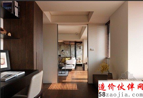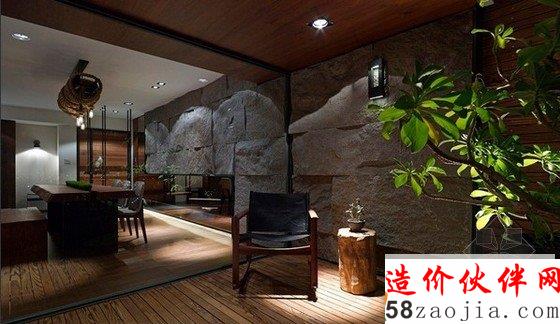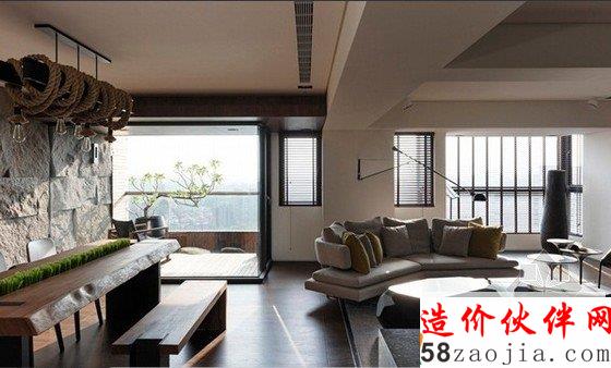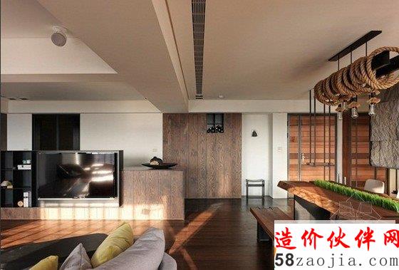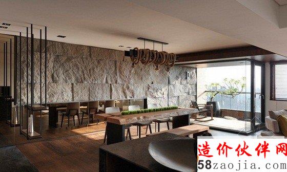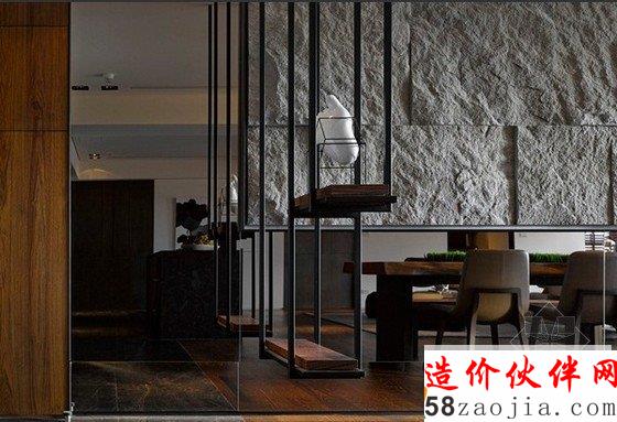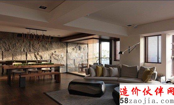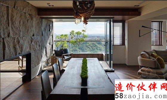 本案位于新北市汐止,荣获 2013台湾室内设计大奖 居住空间类(单层)TID奖,由近境制作公司负责,45坪三房两厅的人文自然风格设计。以粗旷的石材延伸墙面,与天光、水影、绿意相互照映,将阳台内推并以透明玻璃弱化空间的界线,摇身一变成为最佳的休憩地点;因应屋主的生活模式,将客餐区作为开放自由的空间配置,与私密空间的界定则以拉门区分;客厅的电视墙面以木皮搭配铁件规划,赋予空间结构之美;实木长桌上则设计一丛绿意增长出,为空间渲染出自然的绿意,并在造型灯具上以麻绳环绕,重新赋予物件的造型语汇,让自然与生活完美契合。