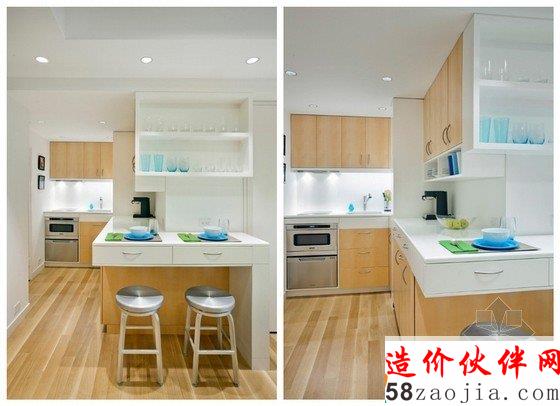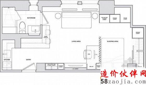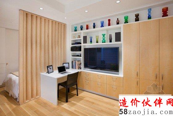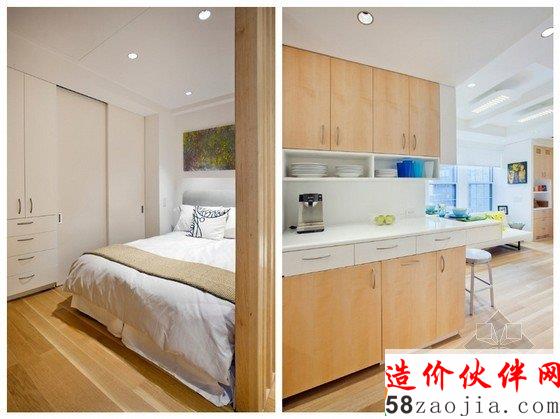 纽约曼哈顿31平方小户型家装,由Allen+Killcoyne Architects设计,吃饭、工作、睡觉被安排在一个空间中,有一个较大的橱柜,能够满足储物需求,因此空间给人的感觉并不是很小。卧室被巧妙的隐藏在百叶窗隔断后,感觉不那么幽闭,只有坐在书桌正面才能看见卧室的情况。睡眠区的天花板上有一个隐形的陷阱门,翻转出来就是一个平板电视。厨房则被藏进角落中,不会让人觉得侵占了生活区域。