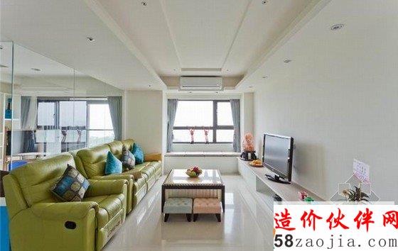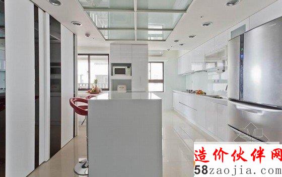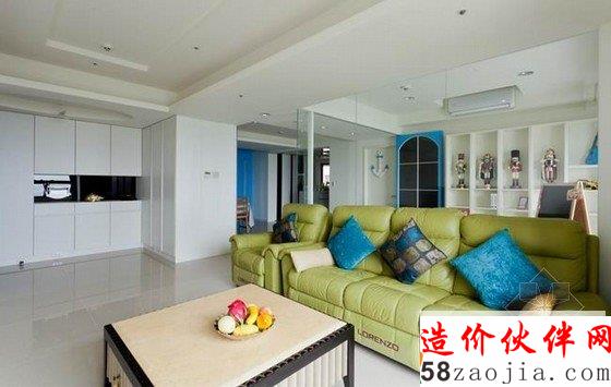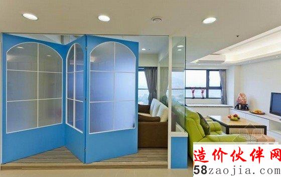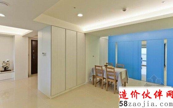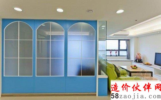 台北简约地中海家居装饰设计,客厅及书房採用折叠门让整体空间放大开放效果,因女屋主喜爱地中海风格,於是搭配地中海圆弧拱门及浅蓝色让整体带进微微得味道。餐厅部分的蓝色墙面搭配明镜让原有狭小的餐厅视觉感官放大,而此餐厅墙面便是客卧及客浴的门片隐藏其身。厨房部分衍生餐厅的效果,厨房採用中岛柜让整体空间的实用上增加。主卧及客卧则跳脱公共空间的效果,让主卧可进入另一个休息元素。