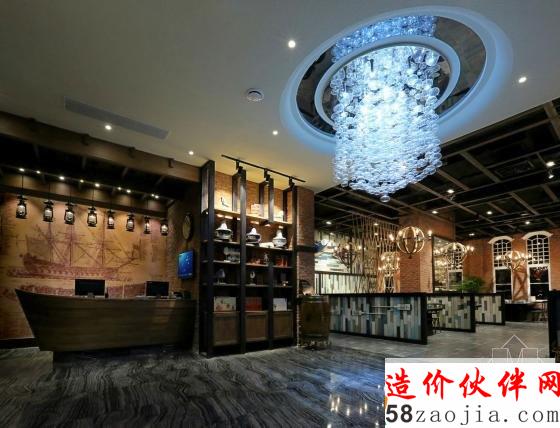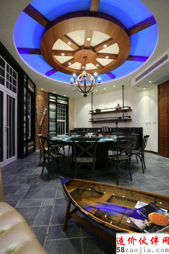 复古栀灯,旧木吊灯的应用令人遐想。餐厅入口处船型服务台与古造船图背景墙相映成趣。一层“东经区”,感受漂浮在岛上的风情与浪漫,放眼窗外,翻滚的波涛,翱翔的海鸥尽收眼底。