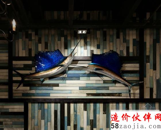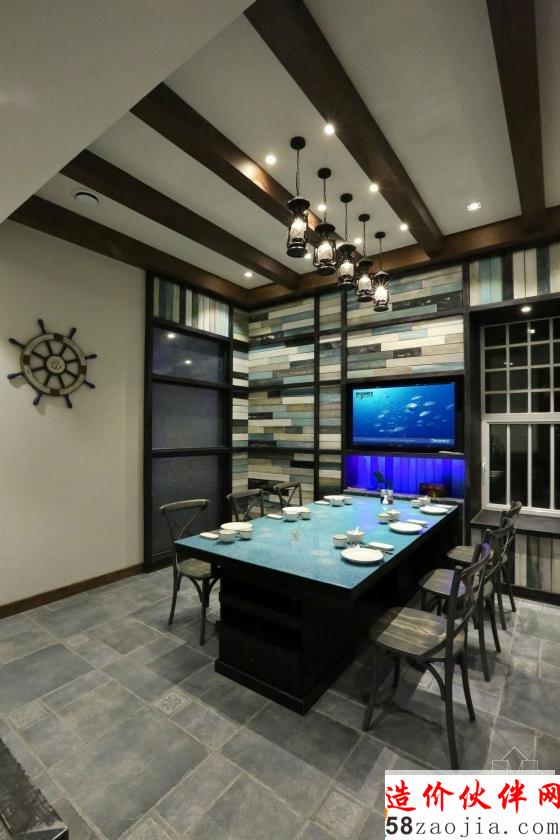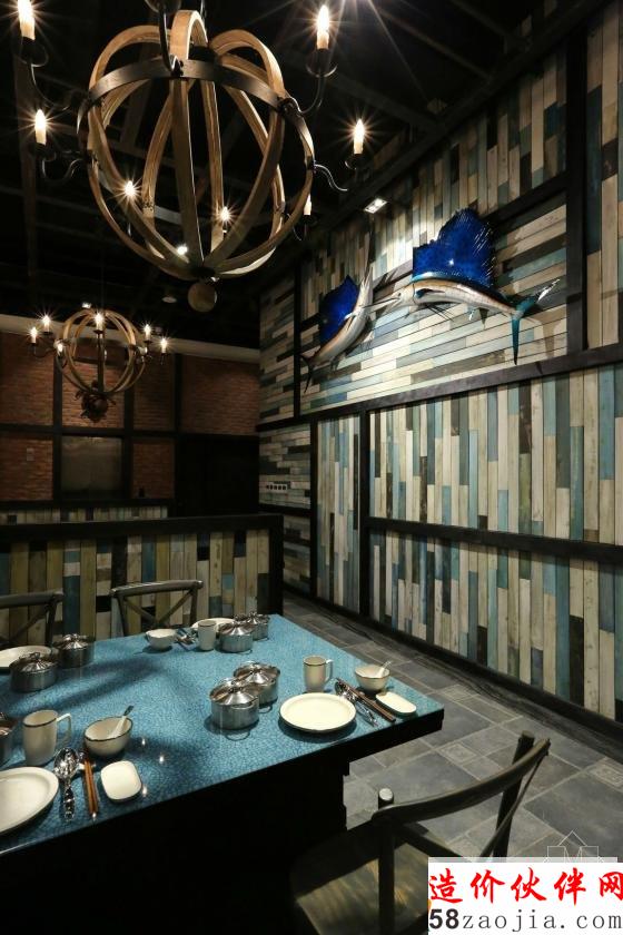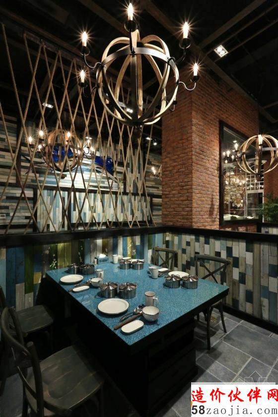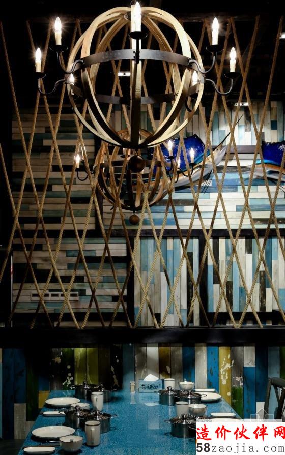 由济南思锐空间设计有限公司所设计的90海里新派火锅,面积约为2200平方米,是一家新派火锅餐厅,浪漫的地中海风与中国传统饮食文化相融合的食尚空间。海蓝色旧木条板.锈铁与白色涂料结合船桨、浮漂、舵轮、仿真旗鱼、古帆船模型等航海风格配饰,营造了一种蔚蓝色的浪漫。