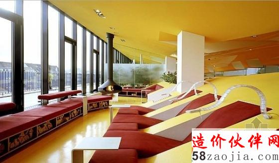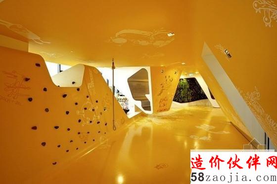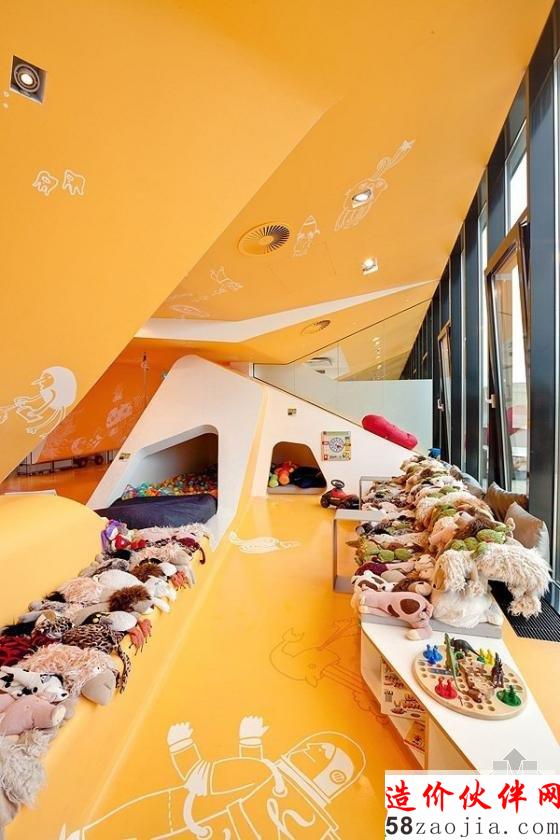 小朋友对事物的认知能力,首先表现为对事物颜色的辨别上,色彩会激发他们的脑部智力发展,促进他们对世界的想象。一般而言,暖色系能让人感觉舒适、积极向上,橙色便是暖色系的代表颜色,也是健康色彩的首选。故德国GRAFT工作室设计打造的这座KU65儿童俱乐部便以橙色为主色调,把那种恐怖压抑的医疗诊所变成一座玩耍的童趣乐园。