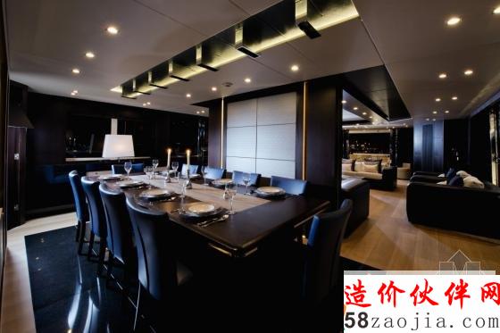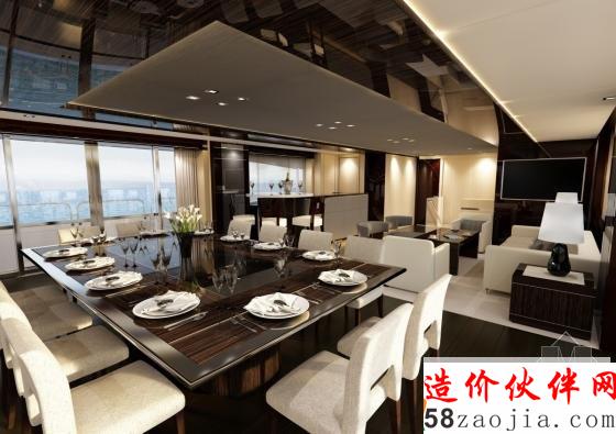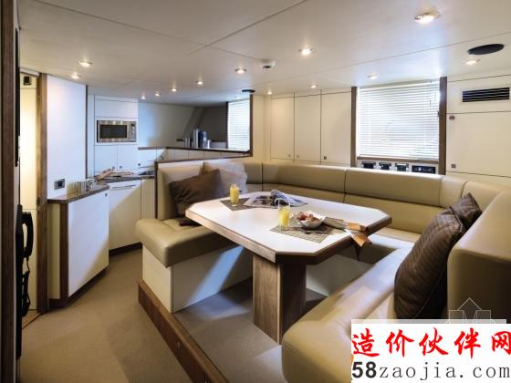 配以全套高级橱柜的厨房布局合理,足够容纳几位厨师同时煮食,哪怕是举行大派对也不用担心食物不够。船上除了用餐区还有独立的早餐区!嵌入的椅子相当的柔软舒适。和游艇设计师沟通之后游艇的买主可以根据自己的实际要求去设计一个个性化的客厅。