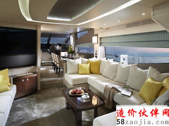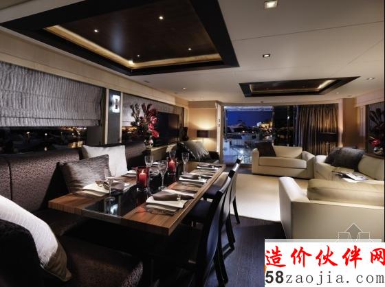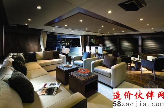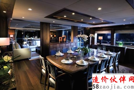 精心设计的宽敞客厅还有一个吧台,让客人能在上面愉快地进行聚会。虽然是游艇,但是沙发足够宽敞,还有吧台,完全有足够空间进行一个鸡尾酒派对。在客厅旁边的用餐区可以供10人同时用餐。