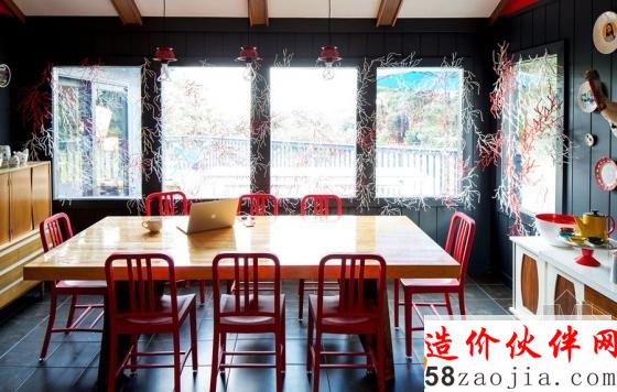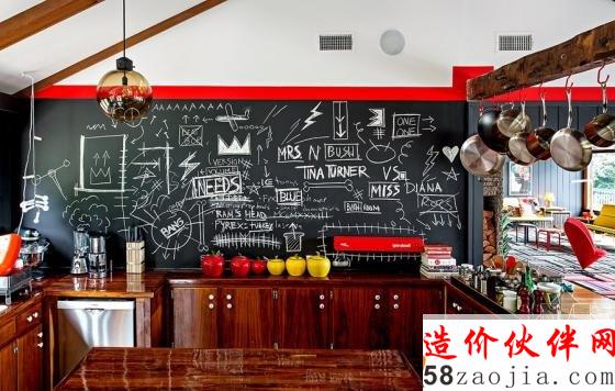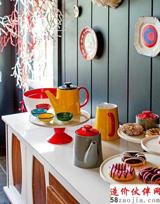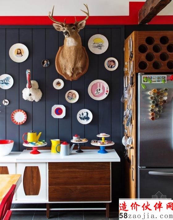 厨房的背景墙设计由黑板和粉笔画组成,红色的边框点缀了空间,直接在木栏杆上悬挂大大小小的锅具,既整洁又实用。在墙面上点缀上多彩的盘子,还有麋鹿造型的装饰,这些都在原本藏青色的墙面下,让这个空间也活跃了起来。厨房的餐具也选用了鲜亮的色彩,各色的小碗,一旁色泽诱人的甜甜圈,让这个厨房更显出了十足的生活味。