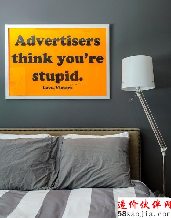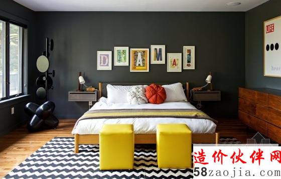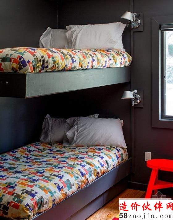 在窗前的独特的装饰,也使这个空间创意无限。藏蓝色的墙面,使这个房间的基调稍显暗淡。但错落有致的床头装饰画的摆放,再加上轻快黄色的坐凳,活跃了这个房间。主卧的设计,通过灰白条纹的床品,使这个空间显得沉着而稳重。橙色的英文字母的装饰画,也让这个空间鲜活了起来。木质的硬板床对于儿童来说,是一个既健康又舒适卧具,高挑的儿童房空间让高低床成为不二的选择。