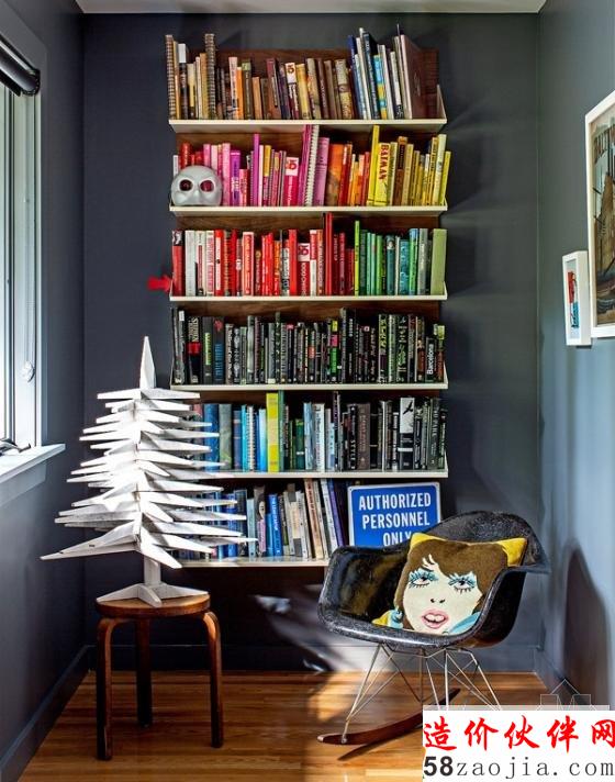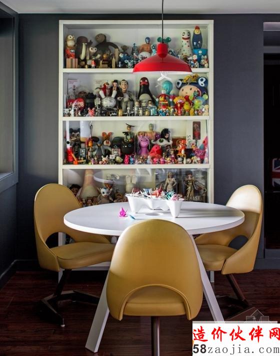 用不同色彩的地毯,将客厅空间划分为两个区域。轻快的黄色沙发,搭配上多彩的靠垫,墙面上则挂上了具有设计感的装饰画,使这个客厅饱满而热烈。考虑到空间的利用,设计了嵌入式的柜子。堆放了整个柜子的玩具,使这个空间充满了童趣感。在客厅一边安装多个隔板作为书架,椅子上的具有创意图案的靠垫和松树造型的摆设,使空间也变得具有创意起来。