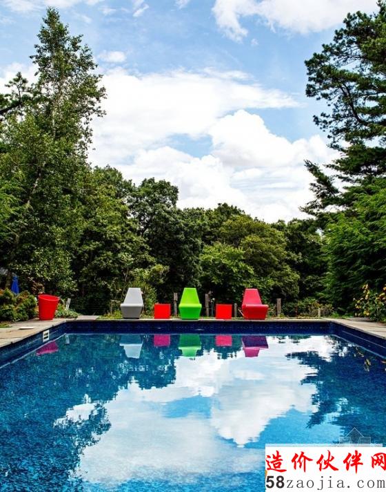 将一池净蓝剔透的泳池,设计在别墅的前院。在泳池前边摆放上多彩的椅子,立刻就点亮了这个空间。客厅完全就是一个多彩的世界,长形的房屋结构,使整个空间显得具有一定纵深感。一旁整面的窗户设计,使得空间的采光极好。创意感鲜亮的红色椅子,搭配上多彩的地毯,使这个空间显得更是活力四射。墙面上的装饰画,也十分得具有艺术感。